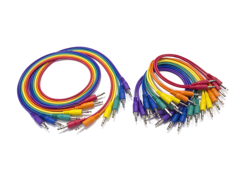 Set composto da 18 cavi (patch chord mini-jack) da impiegare nella programmazione da pannello del sintetizzatore Korg MS-20 mini, o nel collegamento/programmazione modulare di altri sintetizzatori analogici come Volca, SQ-1 o monotribe. I 18 cavi si suddividono in 12 pezzi dalla lunghezza di 25cm, e 6 pezzi da 75cm, i quali si articolano in 6 differenti colori: rosso, arancione, giallo, verde, blu e viola. Per ogni colore abbiamo un cavo da 75 cm e due da 25 cm.