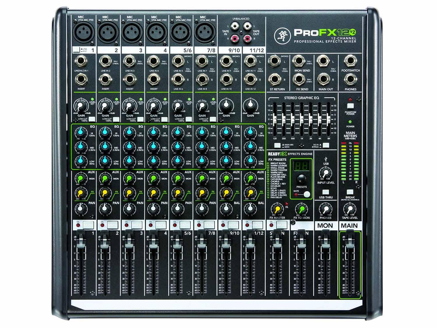 Come dice il nome, il ProFX12v2 è un mixer professionale con funzioni utili ed un suono che compete con alcuni mixer di formato più grande. Mackie ha progettato i preamplificatori Vita avendo in mente il suono live per fornire quella qualità del suono carente in alcuni mixer compatti. Ogni canale dispone di un equalizzatore a 3 bande indipendente ed un filtro low-cut a 100Hz per modellare il suono dei tuoi ingressi. Il motore degli effetti digitali ReadyFX consente di accedere a 16 diversi effetti tra cui riverberi e delay. Mackie ha anche aggiunto effetti chorus per la chitarra. Un equalizzatore grafico a 7 bande può essere assegnato sia alle uscite principali, in modo da regolare con precisione la tua PA o alll'uscita AUX per sbarazzarsi facilmente del feedback nei monitor. Se ti esibisci con le basi, ci sono ingressi (inclusa USB) per il tuo computer portatile o lettore MP3, una uscita cuffie con controllo del livello indipendente e alimentazione Phantom per i microfoni a condensatore. Con la comodità di un ingresso Hi-Z per l'input diretto degli strumenti, non c'è un motivo per non possedere un ProFX12v2.