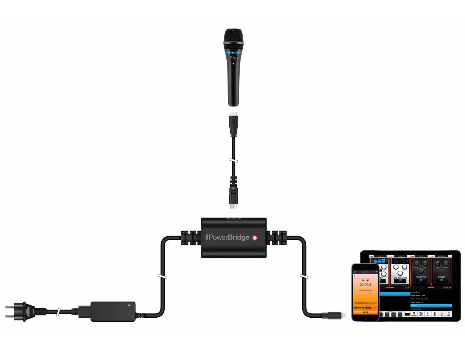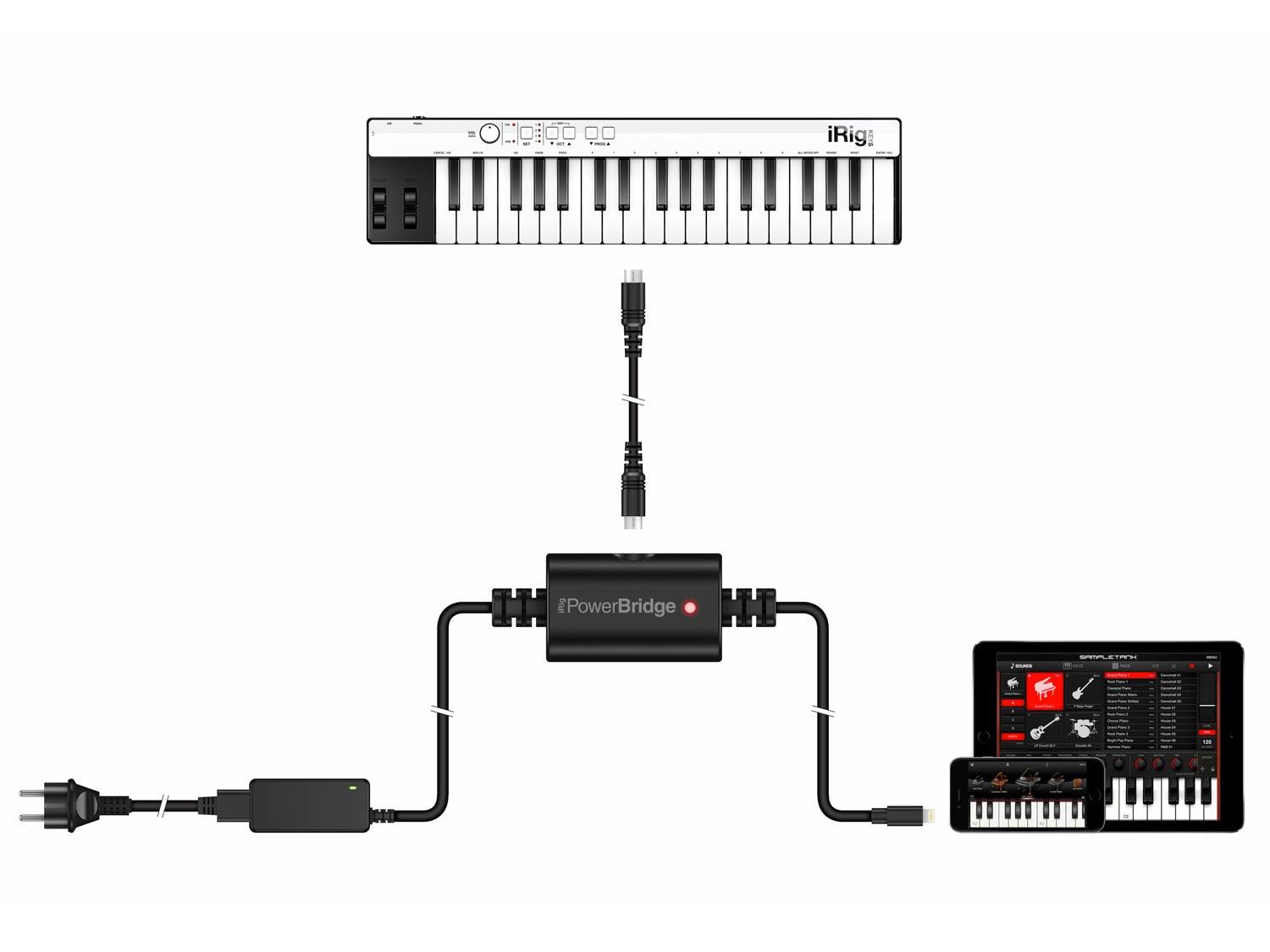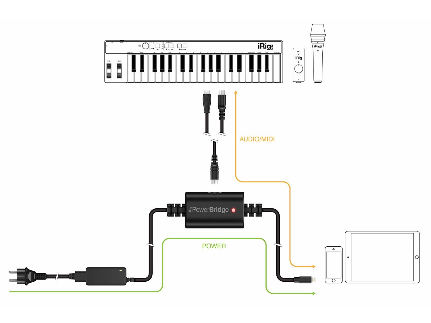 iRig PowerBridge combina un alimentatore ed un convertitore di potenza a bassissimo rumore che si collega a una presa di corrente da una estremità e ad un iPhone, iPad o iPod touch Lightning dall'altra. Tra le due estremità c'è un connettore femmina Mini-DIN che può essere utilizzato per collegare qualsiasi accessorio iRig digitale con un mini-DIN o una porta Micro-USB. Attraverso questo collegamento, iRig PowerBridge permette la ricarica continua pur passando informazioni audio e MIDI tra il tuo accessorio iRig digitale ed un iPhone, iPad o iPod touch. Attraverso questa configurazione semplificata, ora è possibile mantenere il tuo iPhone, iPad o iPod carico e utilizzare gli accessori iRig digitali preferiti e le potenti app IK per tutto il tempo che vuoi, non importa se si stia sul palco, in studio registrazione o semplicemente a casa. E' il complemento perfetto per potenti accessori hardware come iRig Mic HD, iRig Keys, iRig Pro, iRig HD, iRig Pads e iRig MIDI 2.