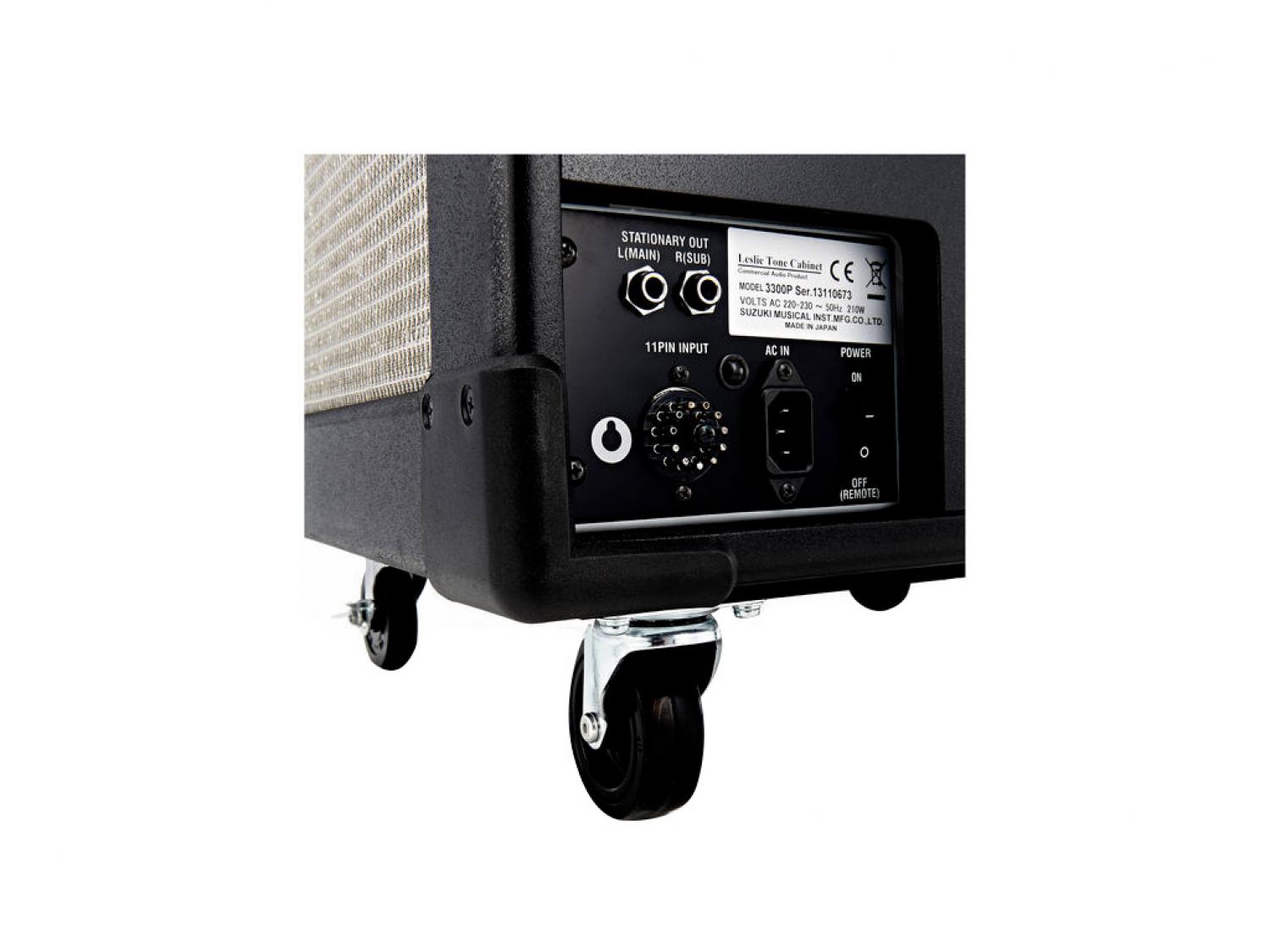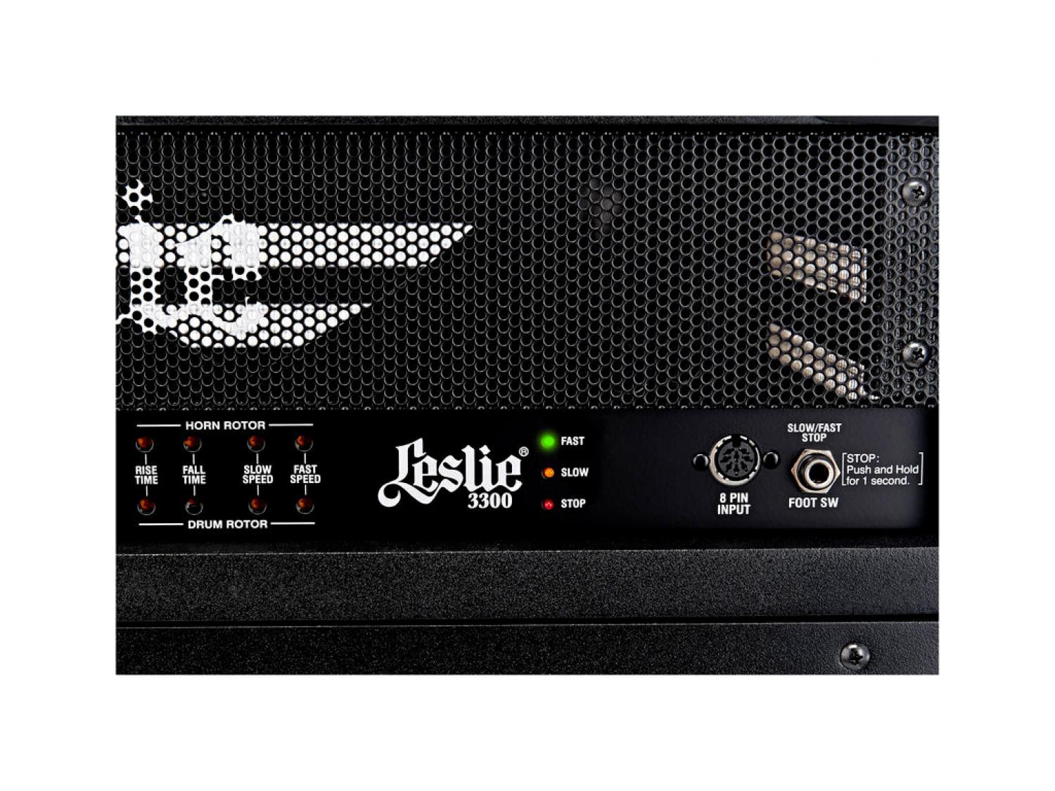 Il Leslie 3300 è stato progettato pensando ai musicisti professionisti. Questo Leslie a singolo canale presenta un rotore a tromba a 2 velocità che utilizza il famoso driver Ferrofluido ed un rotore dei bassi con un massiccio woofer da 15". E' alimentato da un assordante amplificatore da 300 Watt RMS a stato solido con un preamplificatore valvolare. Sono disponibili prese 11 poli ed 8 poli Leslie nonché un ingresso di linea jack 1/4". Il Leslie 3300 può essere collegato alla maggior parte degli organi e tastiere elettroniche attualmente sul mercato. Questo Leslie è alloggiato in un cabinet robusto, costruito con una finitura nera ad alto impatto. Le ruote pesanti renderanno un gioco da ragazzi il trasporto alla prossima performance.