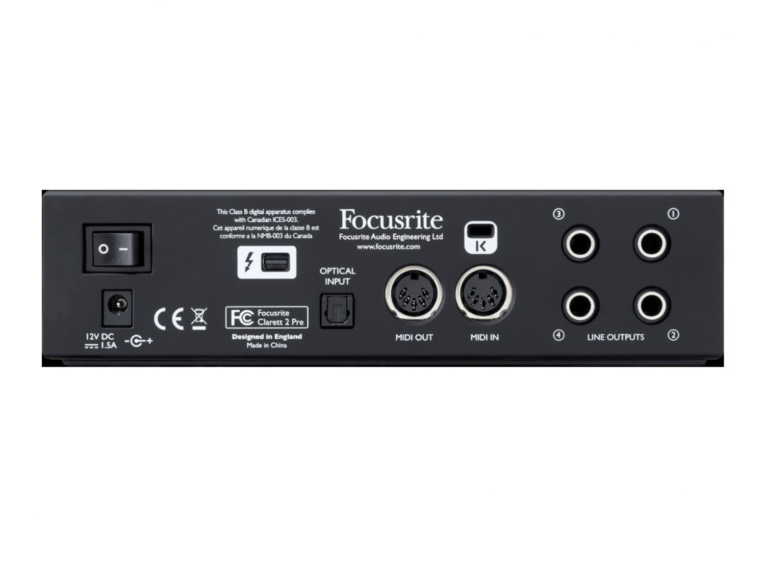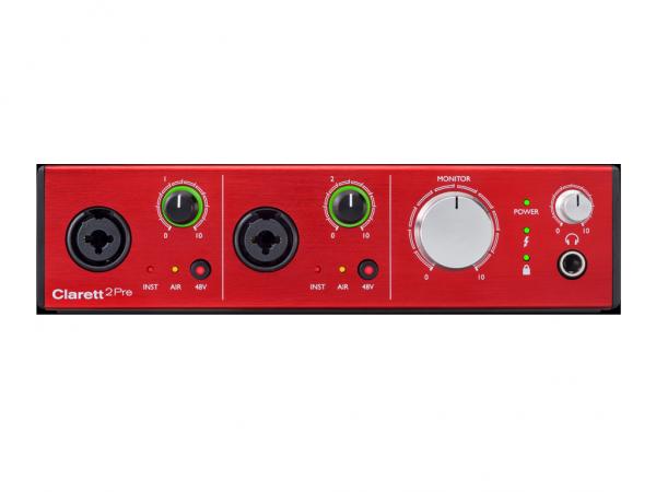 Con 10 ingressi e 4 uscite, l'interfaccia Thunderbolt Focusrite Clarett 2Pre è l'ideale per l'artista solista. Comprende due preamplificatori microfonici Clarett di nuova concezione ai quali si può accedere direttamente dal pannello frontale, vanta una conversione digitale ai vertici della categoria ed un livello della latenza di andata e ritorno di 1ms, abbastanza basso per usare i plug-in durante il monitoraggio delle registrazioni attraverso la DAW: ad esempio per aggiungere riverbero nelle cuffie del cantante. I due preamplificatori microfonici si distinguono per rumore (EIN -128) e distorsione incredibilmente bassi, oltre ad offrire l'effetto "Air" selezionabile che modella il suono Focusrite dei famosi preamplificatori ISA con trasformatore. Sono presenti controlli gain particolari che permettono di apportare modifiche più fluide e naturali. Focusrite è nota per la conversione digitale di alta qualità quasi quanto lo è per i suoi preamplificatori microfonici, e l'interfaccia 2Pre non fa eccezione. Equipaggiata con gli ultimi convertitori digitali di precisione Focusrite, l'interfaccia offre una conversione a 192kHz / 24-bit oltre a una gamma dinamica reale fino a 118dB (A/D da preamplificatore microfonico) / 119dB (D/A line out). I due ingressi principali sono posizionati sul pannello frontale sotto forma di prese combo XLR / TRS mic/instrument/line e caratterizzano i preamplificatori microfonici Clarett di nuova concezione; inoltre, un ingresso ottico ADAT può essere utilizzato per espandere la capacità di ingresso della 2Pre con otto canali digitali aggiuntivi. Gli ingressi Instrument sono stati progettati con un headroom eccezionale, per accettare pickup per chitarra molto potenti senza distorsioni. Clarett 2 Pre include i "Gain Halo" di concezione Focusrite che circondano i controlli del gain. Questi danno una semplice indicazione di "go/no-go" del livello: verde indica un segnale in entrata, rosso indica che il segnale è troppo forte.