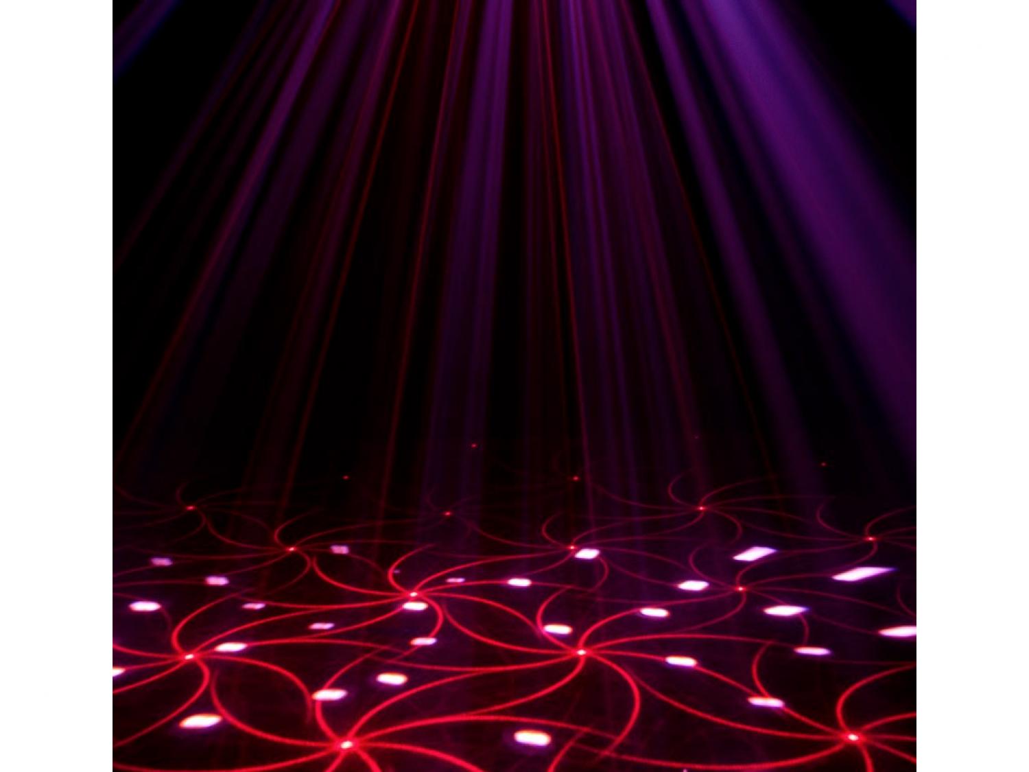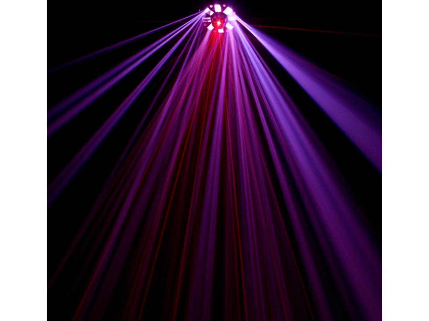 • 3 FX in 1: Moonflower, Strobo e Laser con 6x 5W (RGBWYP) HEX LED + 8x 3W LED Bianchi + Laser Red & Green produce raggi che cambiano colore