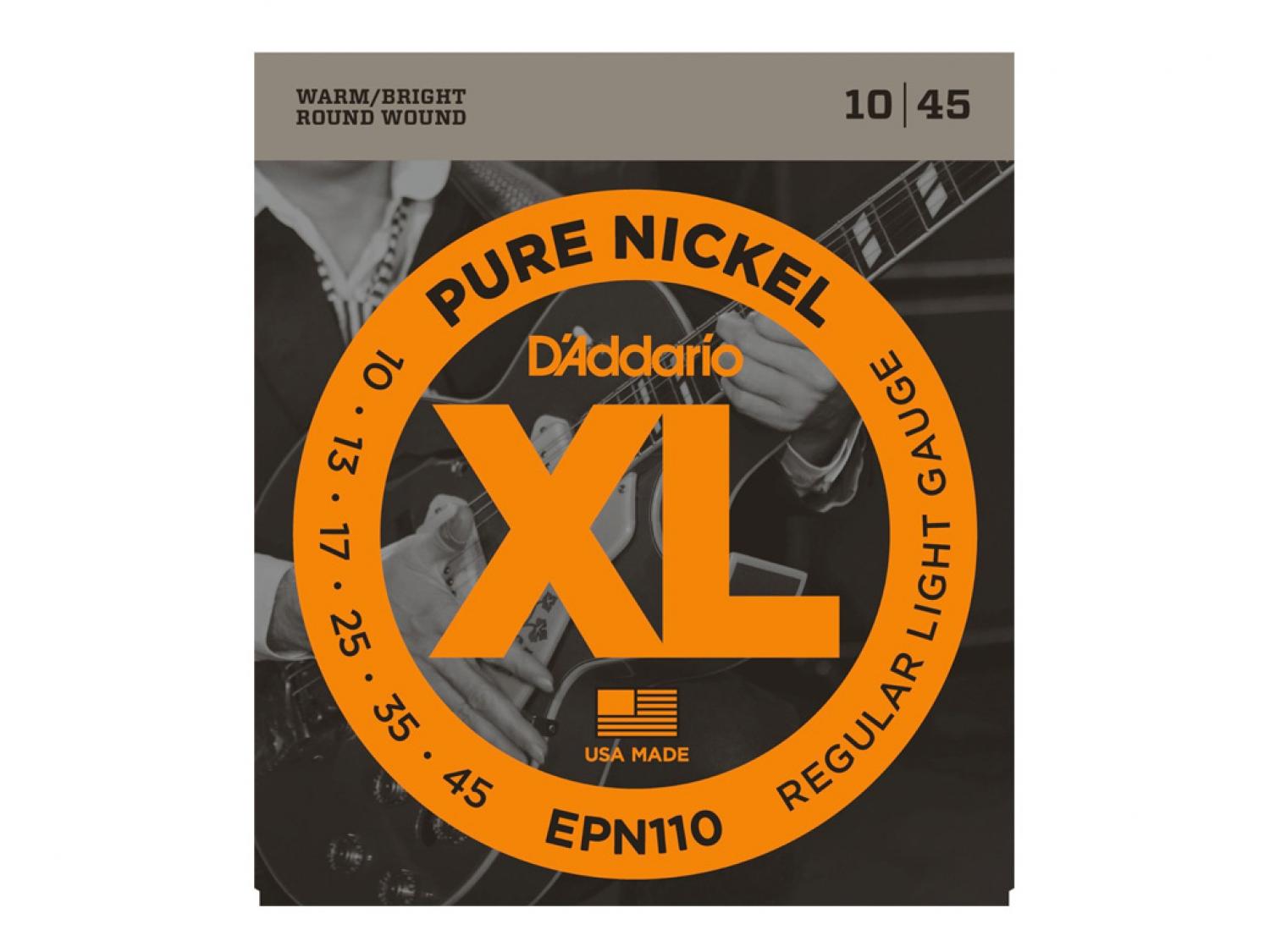 Le corde EPN110 uniscono la suonabilità del calibro light più venduto di D'Addario con un suono più caldo, vintage. Le corde D'Addario XL Pure Nickel guardano indietro agli anni '50, quando il nichel era la lega principale che si trovava nelle corde per chitarra elettrica. Le corde in nichel puro sarebbero sostituite sostituiti dall'acciaio nichelato negli anni '60 quando i chitarristi richiesero un suono più brillante ed un maggiore magnetismo. Pure Nickel riporta ai timbri più caldi, i più ricchi che si trovano nel blues tradizionale, rock classico, rockabilly, ed altro ancora.