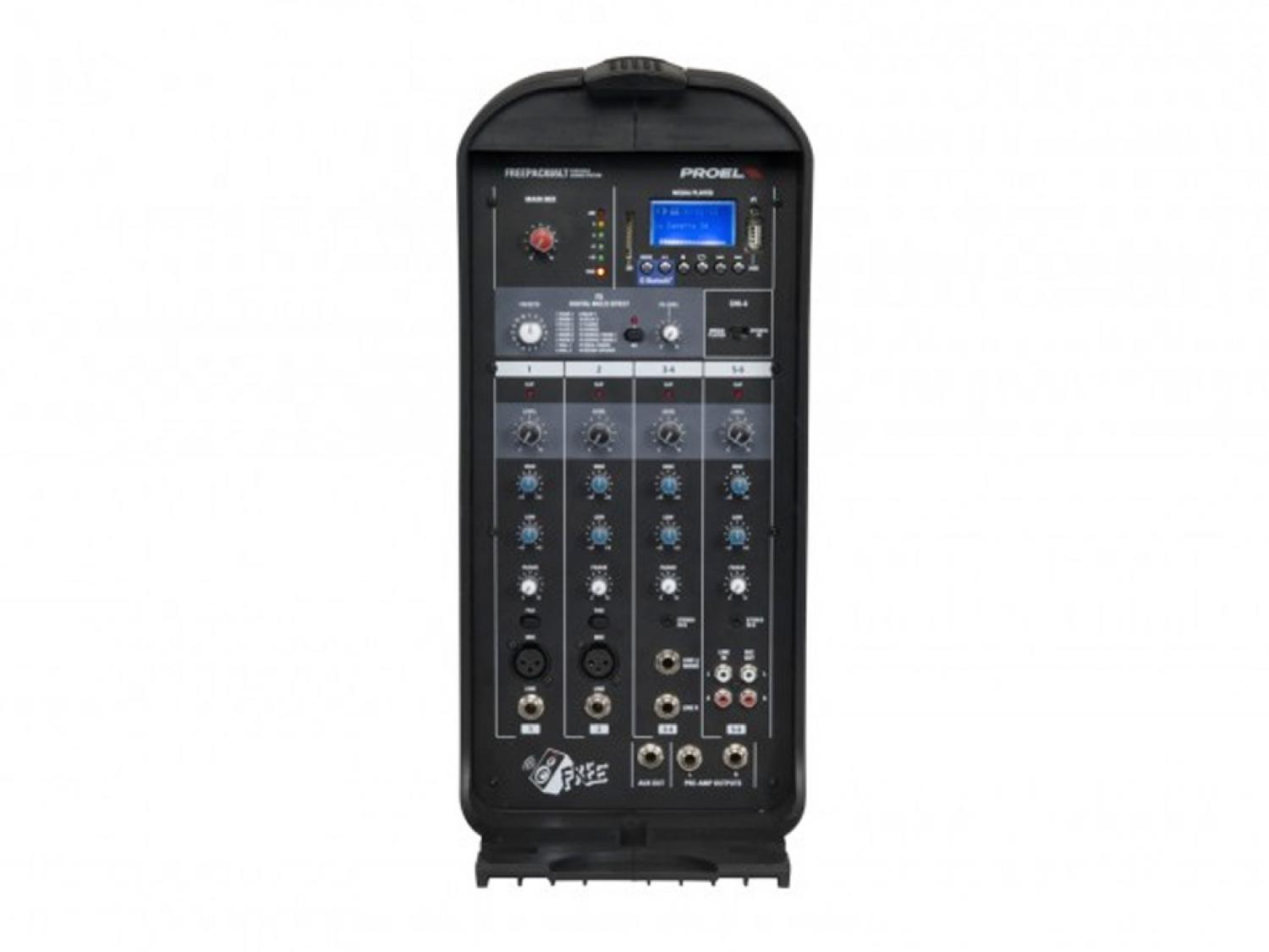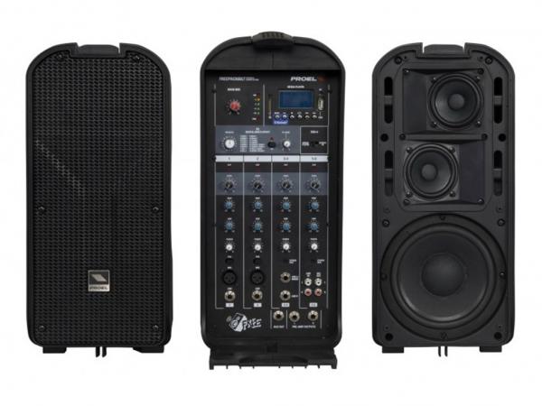 Freepack65lt è un sistema audio completo in stile "valigetta" che unisce in un formato estremamente compatto e portatile, tutto ciò di cui il musicista necessita: un mixer completo con effetti digitali e lettore MP3, un potente amplificatore, due diffusori e i cavi di collegamento. Benché di dimensioni molto compatte, veloce da montare e facile da utilizzare, Freepack65lt offre un set completo di funzioni ed una qualità sonora sorprendente per sistemi audio di questo tipo. Il mixer amplificato con un set completo di funzioni e lettore MP3 con connessione Bluetooth è abbinato ad una coppia di diffusori integrabili con il mixer stesso in un unica valigetta, il che rende semplicissimo il trasporto ed il montaggio. Il mixer include anche un capiente scomparto che può contenere i cavi di connessione ad altri accessori. I due cavi Prolel ad alta qualità forniti con il sistema sono dotati di robusti connettori a jack in metallo. I diffusori, alloggiati in cabinet leggeri in polipropilene, utilizzano altoparlanti selezionati e filtri crossover accuratamente progettati, in grado di offrire una riproduzione definita e nitida oltre ad una risposta in frequenza estesa e lineare e ad una elevata pressione sonora. Il Freepack65lt include, inoltre, due batterie ricaricabili da 12V in grado di fornire fino a 4-5 ore di funzionamento senza collegamento alla rete elettrica. Grazie alla portabilità e versatilità Freepack65lt può essere utilizzato in una grande varietà di applicazioni, come esibizioni dal vivo di cantanti e musicisti, eventi sportivi o didattici e presentazioni di vario genere.