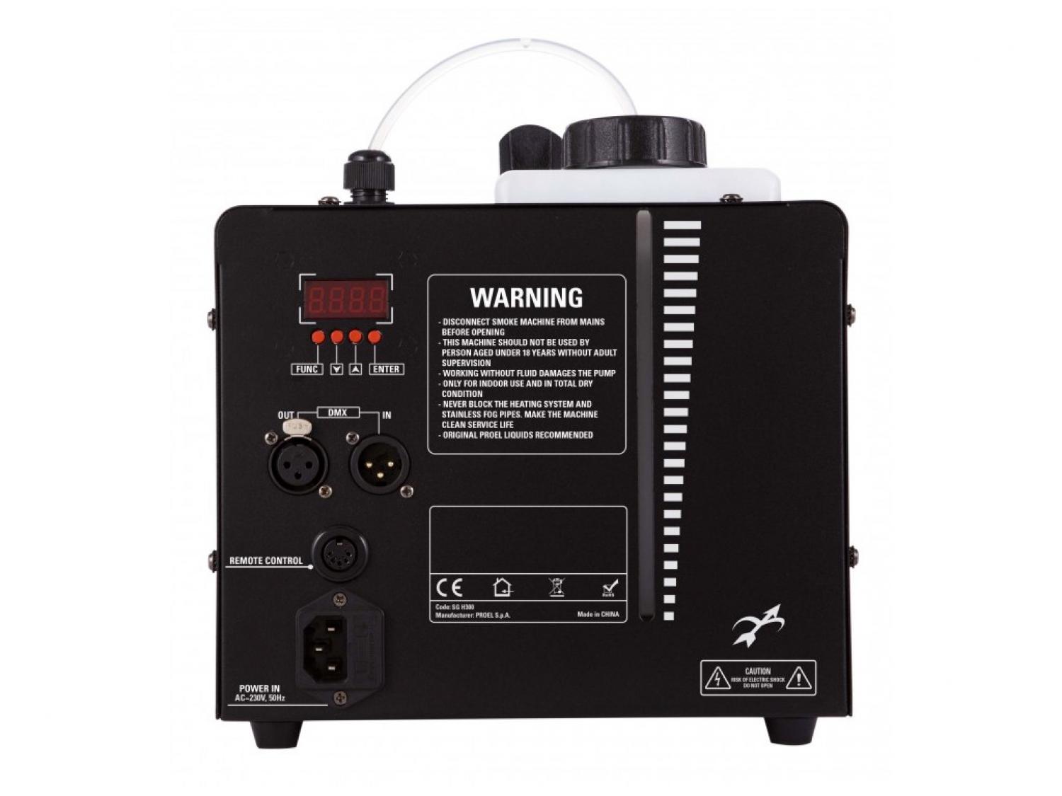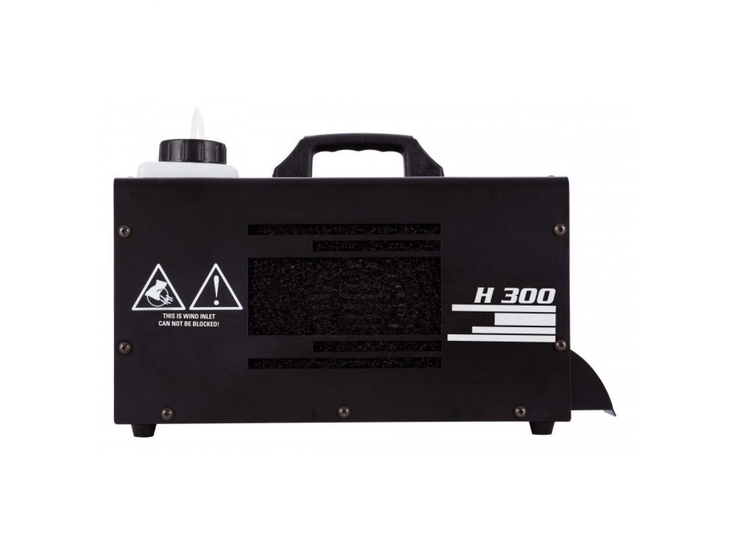 Macchina della nebbia della serie H studiata per il mondo SDJ. All'interno delle suo corpo compatto troviamo una macchina con caratteristiche ereditate dagli effetti ambientali del mondo dell'intrattenimento live professionale. Come la sua sorella maggiore H1500, la H300 garantisce una copertura perfetta di ambienti di medie e piccole dimensioni indoor ed outdoor. La sua nuova tecnologia utilizza una pompa d'aria che oltre a permettere un'ottimale miscelazione tra fumo ed aria, garantisce anche un'estrema pulizia del condotto di riscaldamento, evitando quei fastidiosi intasamenti derivanti dalle normali formazioni calcaree. L'effetto nebbia generato è secco e sottile, non ostacola la visibilità allo spettatore e grazie ad una potente ventola interna a velocità controllabile è possibile saturare l'ambiente in tempi brevi. La macchina è dotata di un controllo DMX a doppio canale, di una modalità manuale richiamabile dal pannello di controllo e di un comodissimo radiocomando che consente l'avvio o la sospensione dell'effetto ambiente.