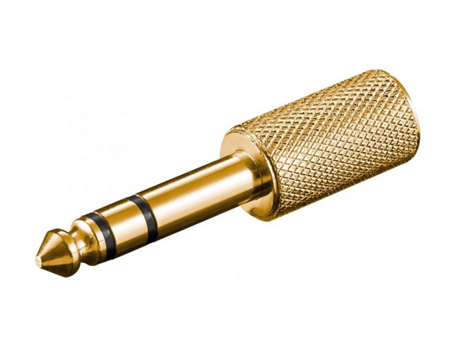 Adattatore jack stereo da 3,5mm a 6,35mm. Il corpo è realizzato in metallo dorato.