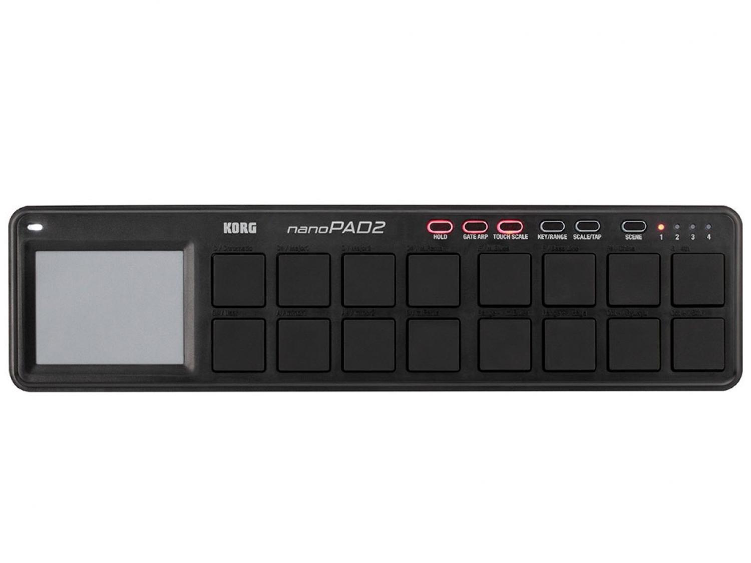 nanoPAD2 offre 16 pad sensibili alla dinamica utilizzabili su 4 banchi differenti, per un totale di 64 pad, e un touch pad X-Y. In più, con la nuova funzione "Touch Scale" derivata dal Kaossilator PRO potrai suonare in modo intuitivo frasi musicali direttamente dal touchpad. La funzione "Gate Arp" - anch'essa derivata dal Kaossilator Pro - servirà per trasmettere note MIDI arpeggiate in sequenza e sincronizzate alle impostazioni di tempo (Tap Tempo e Temp Sync). Combinando le funzioni Touch Scale e Gate arp potrai suonare frasi melodiche e ritmiche sincronizzate alla velocità desiderata passando semplicemente il dito sul touchpad, e/o premendo i pad.