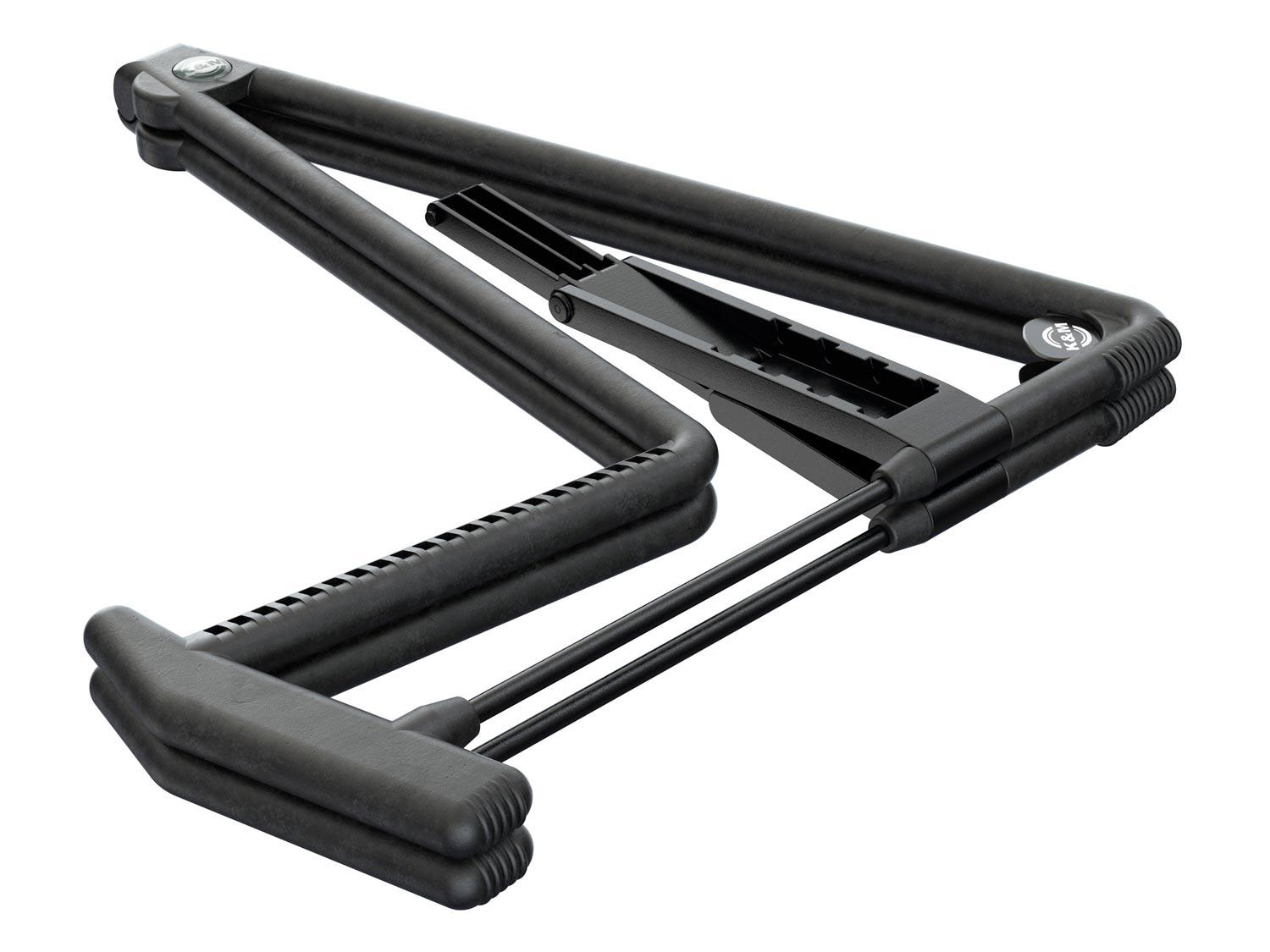 Il supporto è particolarmente curato grazie alla nuova elaborata struttura in gomma. Con la nuova innovativa traversa regolabile, chitarre di dimensioni diverse o anche altri strumenti come violoncelli o un corno francese possono essere poggiati sul supporto. Lo stand si ripiega completamente piatto per essere conservato e trasportato facilmente.