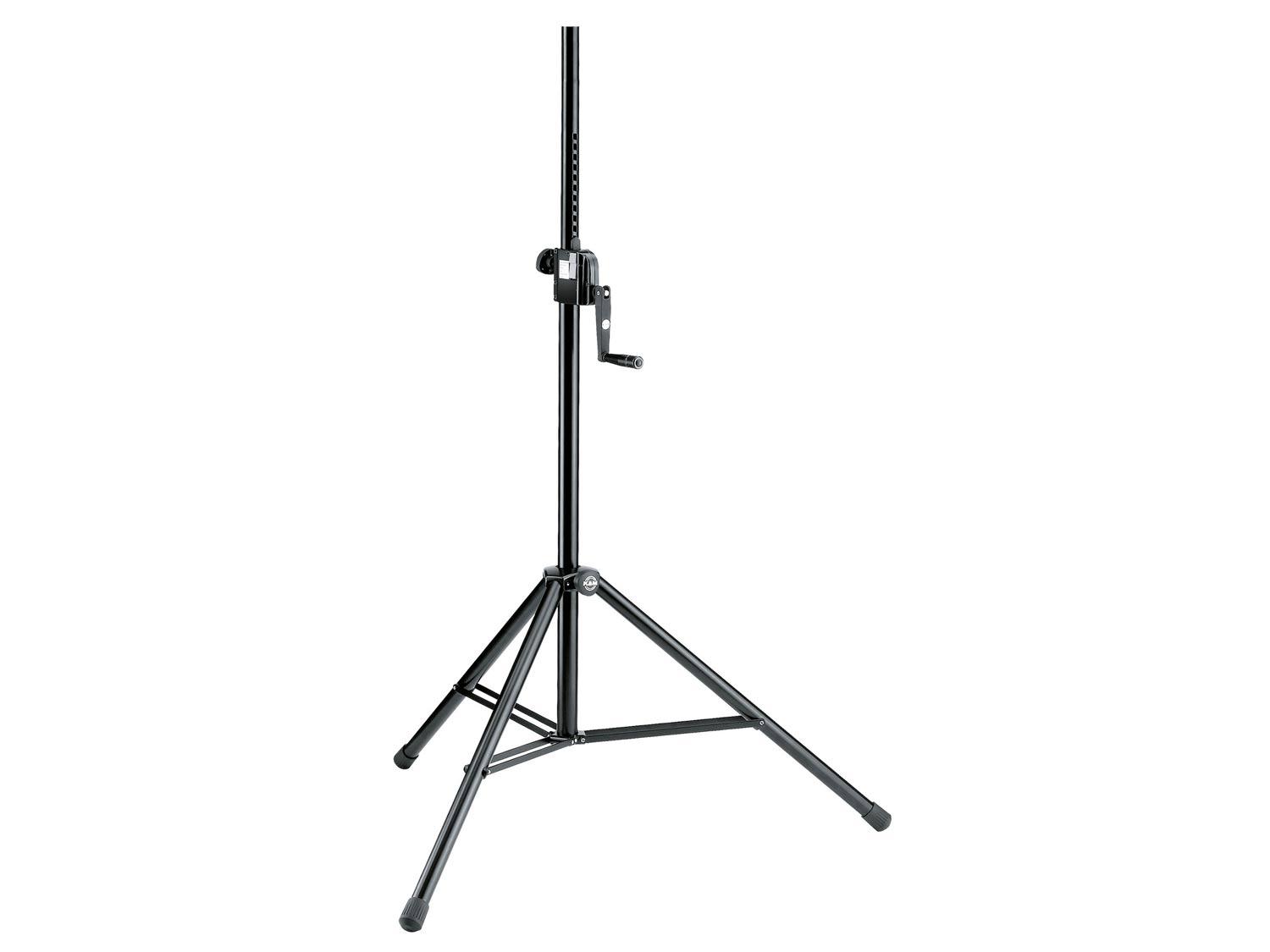 Un basamento per altoparlanti in acciaio con morsetti in zinco pressofuso per uso professionale. Regolazione continua in altezza con sistema manovella e pulsante che impedisce un movimento inverso incontrollato. Vi è una vite di bloccaggio aggiuntiva per una maggiore sicurezza. Diametro del tubo finale da 35mm, adatto per gli altoparlanti e barre di illuminazione con un connettore M10 integrato.