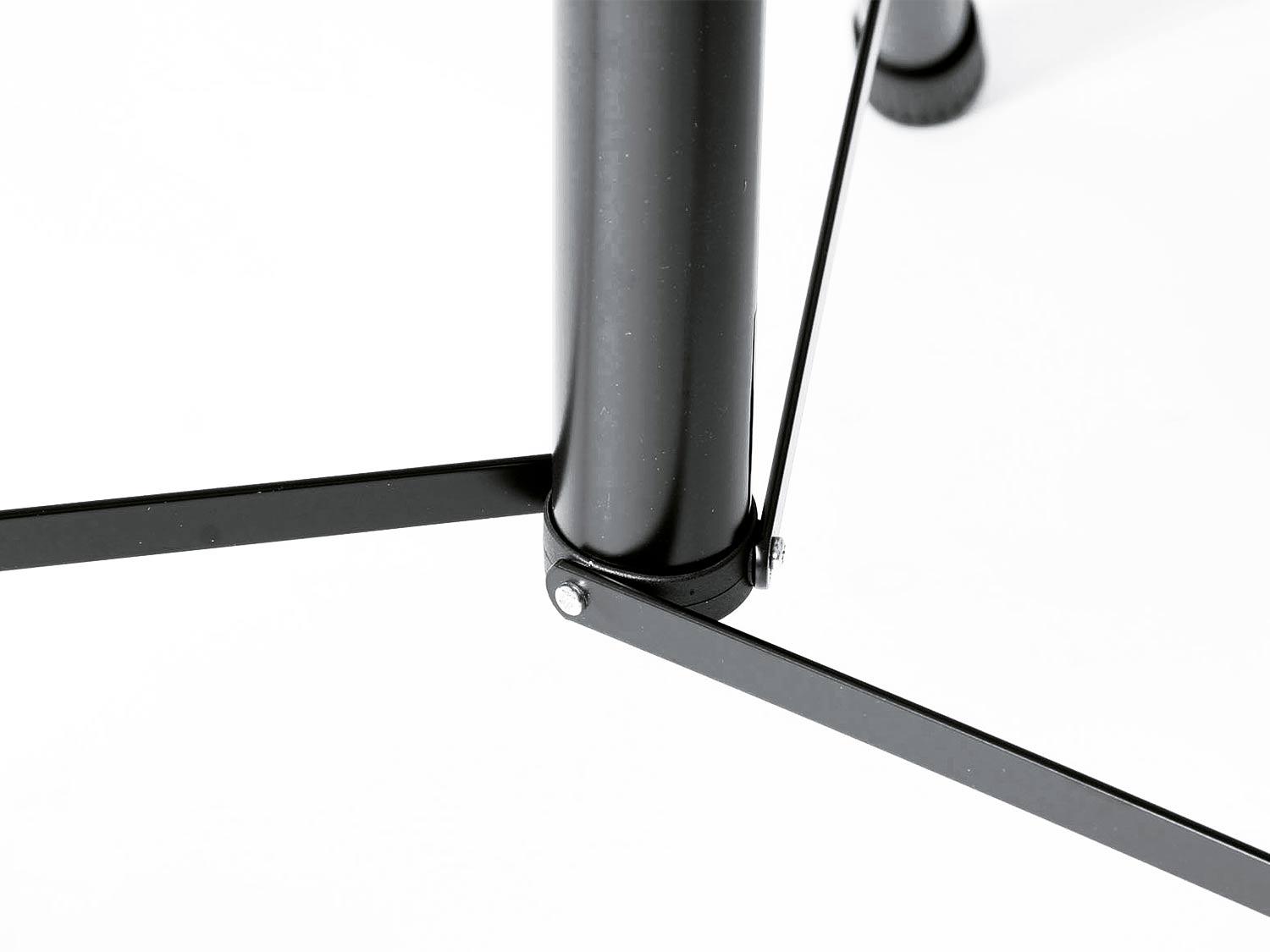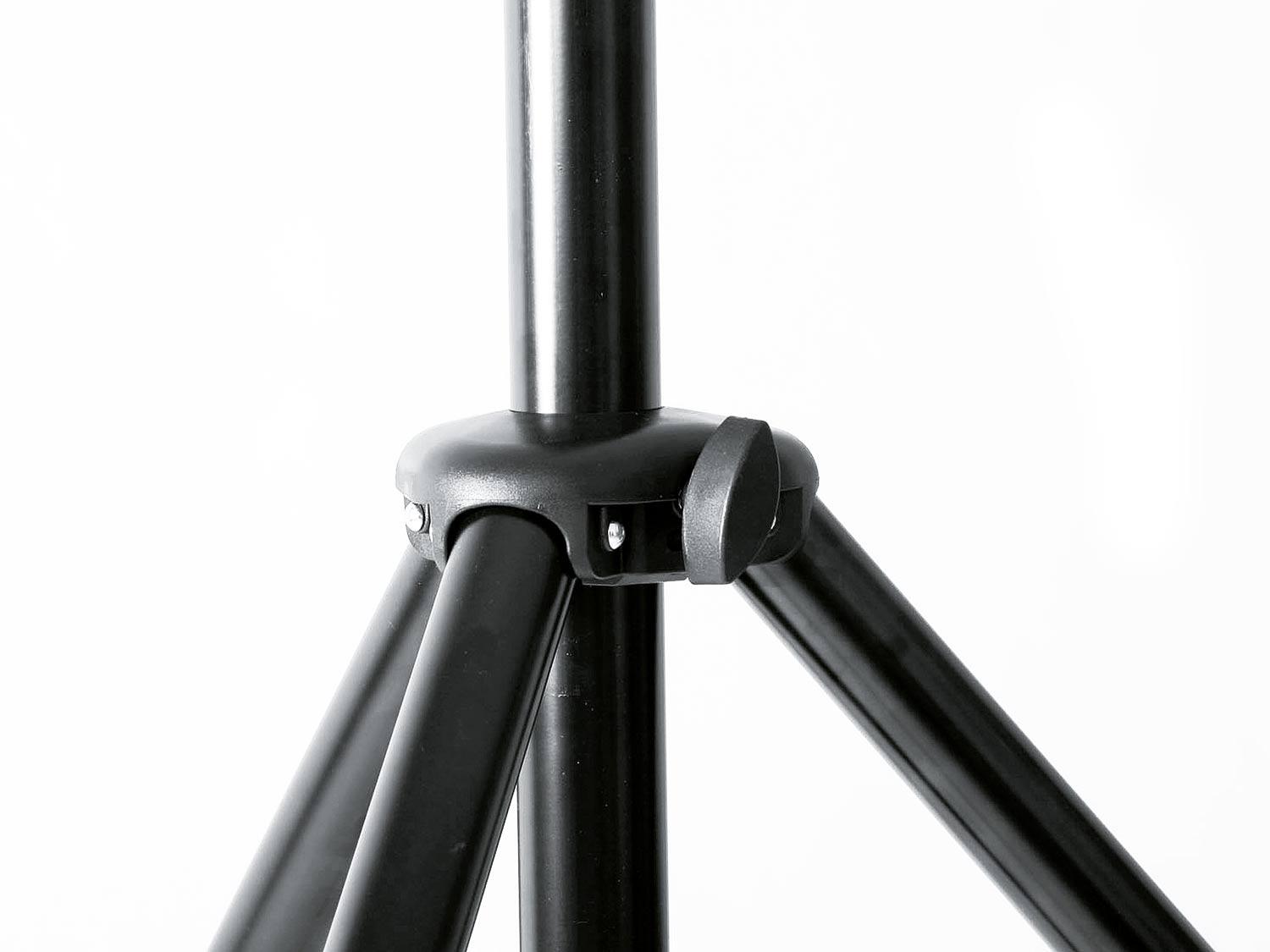 La costruzione di questo stand per altoparlanti in alluminio è stata notevolmente migliorata. Le nuove gambe con un diametro del tubo di 35mm e le grandi protezioni fisse alle estremità dei piedi garantiscono stabilità e sicurezza. Fori incisi al laser, robuste rondelle in plastica migliorano il coefficiente di attrito tra gambe e bretelle, e prevengono i graffi della finitura. Un morsetto compatto con un sistema a pulsante brevettato permette la regolazione in altezza del supporto facile da usare. La vite di bloccaggio fornisce stabilità aggiuntiva ed assenza di vibrazioni.