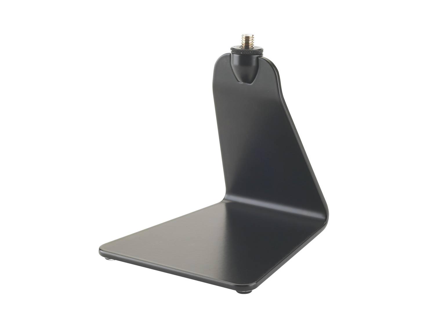 Design piatto e funzionalità sono le caratteristiche speciali di questo supporto da tavolo per microfono unico. La base piatta e stabile fornisce una costruzione facile da usare, salva spazio. Un'ampia superficie posteriore è perfetto per l'etichettatura. Sia che si utilizzi una targhetta o il logo della società con questo straordinario supporto da tavolo, saprete esattamente chi ha il microfono. Quattro piedini in gomma riducono i rumori indesiderato che raggiungono il microfono.