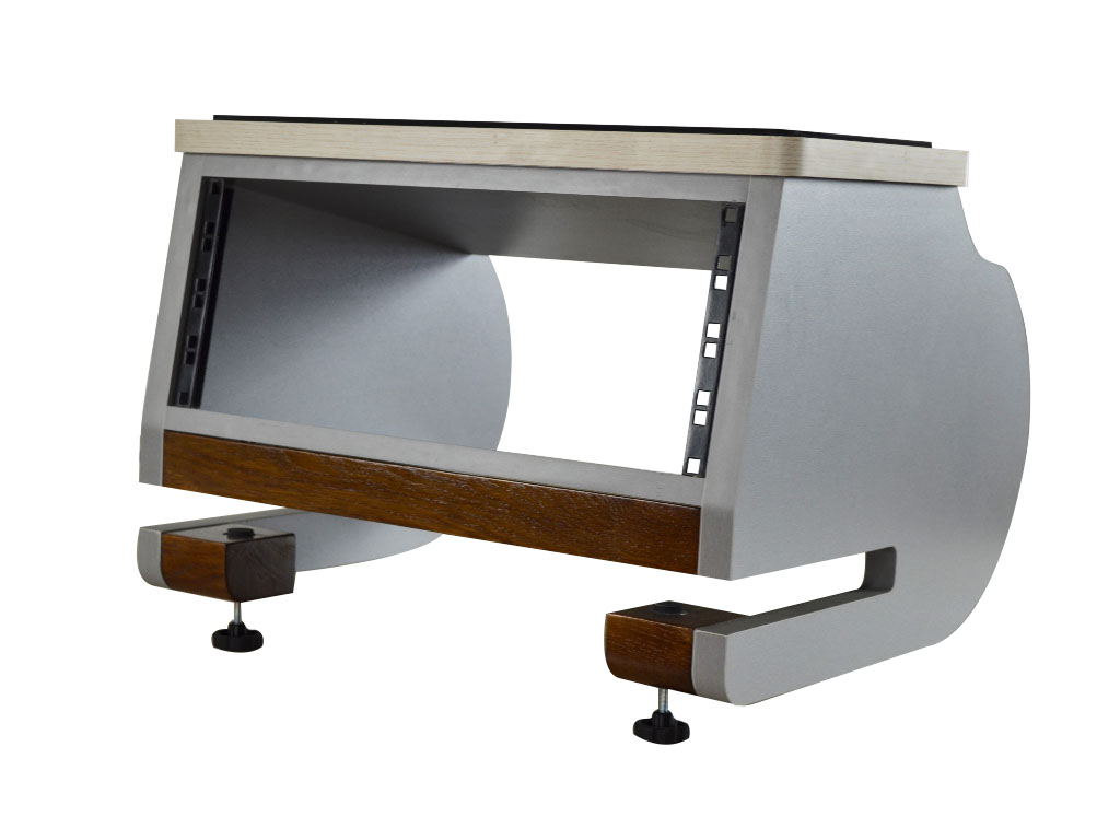 Uno spazio rack "Slide-on & Tighten" che si aggancia alla tua scrivania ed utilizza solo una frazione dello spazio che occupa un normale rack. Dispone di 4 spazi rack più un superficie superiore imbottita per le tue casse, un monitor, etc.