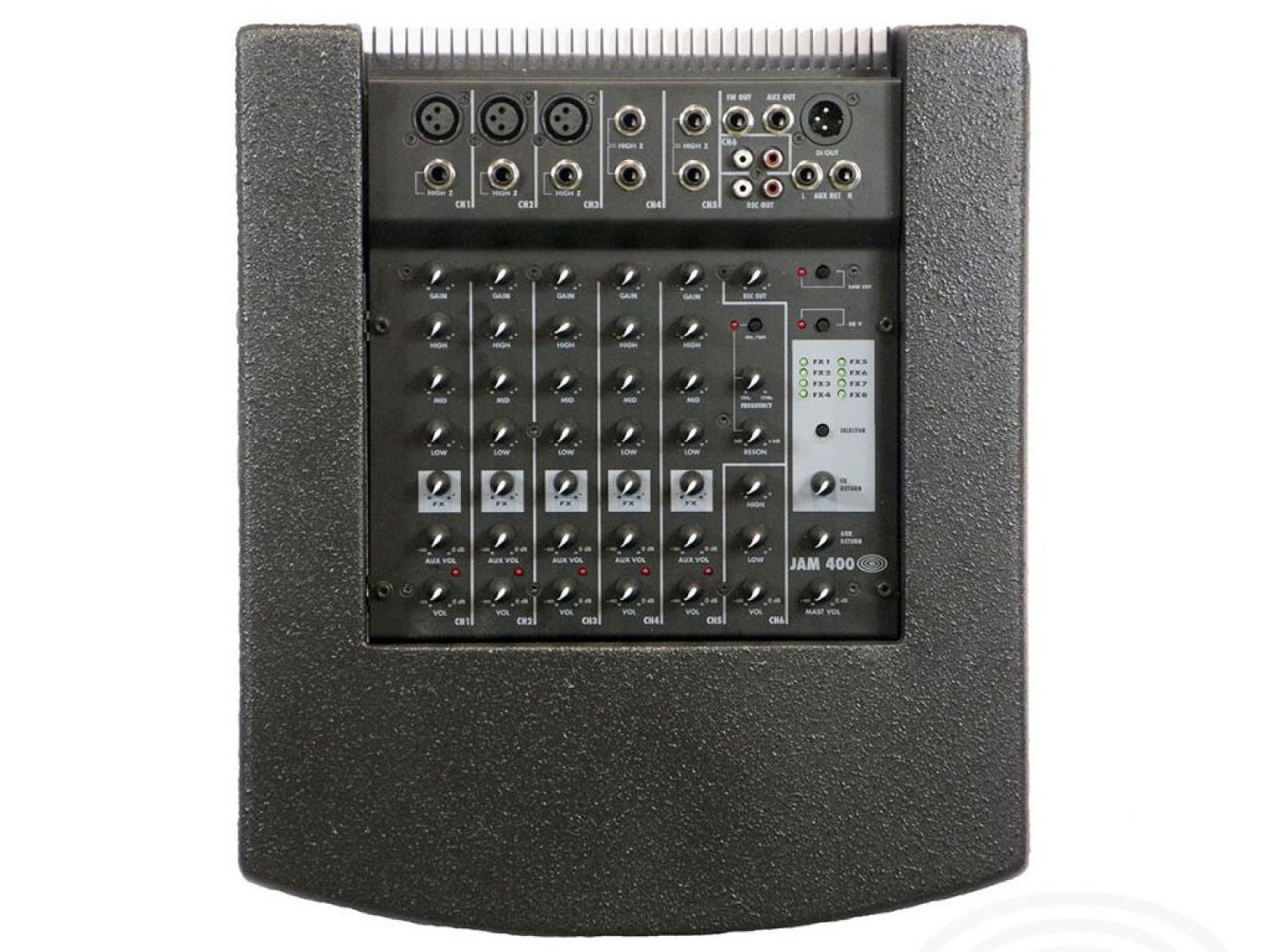 Un cabinet estremamente portatile che fornisce un numero sufficiente di caratteristiche per i più esigenti degli esecutori. Dotato di tromba da 1" e due woofer da 8", il JAM 400 fornisce una potenza piena di 400W. Una gamma di ingressi XLR, Jack e Phono ha il potenziale per consentire a solisti, duo ed ensemble di esibirsi con un singolo leggero amplificatore. La superficie di controllo del JAM 400 fornisce un impianto di mixaggio intuitivo ma completo per un facile set-up e regolazioni sul palco durante le esibizioni. Funzionalità avanzate come un uscita subwoofer selezionabile, controllo anti-feedback variabile, alimentazione Phantom e molteplici effetti digitali sono incluse. Un Crossover selezionabile integrato consente l'aggiunta di un subwoofer attivo per creare un sistema attivo a 3 vie completo, in grado di fornire enormi riserve di potenza per ogni situazione musicale.