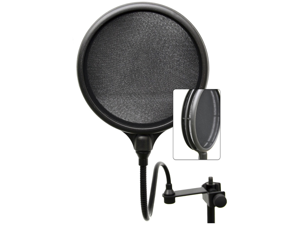 Filtro antipop regolabile con speciale schermatura ottenuta mediante rete in nylon a doppio strato che riduce l'eccessiva pressione di alcune consonanti come "p" e "b" e allo stesso modo minimizza le fastidiose sonorità provocate dalle sibilanti, senza attenuare gli acuti. Il gambo flessibile offre maggior accuratezza nella regolazione e il clip di fissaggio ne consente il montaggio su qualsisi asta.