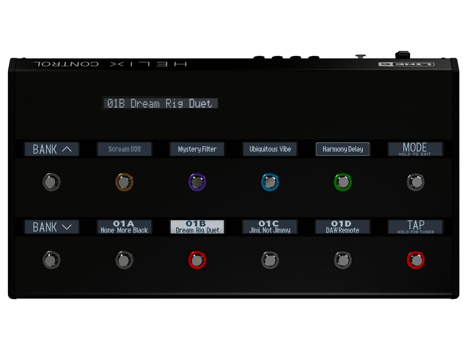 Helix Rack può essere controllato da qualsiasi dispositivo MIDI compatibile, ma l'aggiunta di Helix Control offre le stesse funzionalità della pedaliera Helix, aprendo un nuovo mondo di creatività. Con Helix Control collegato tramite un singolo cavo, gli utenti Rack possono selezionare un blocco per editare toccando un footswitch, creare etichette personalizzate per le scribble strip, collegare fino a tre pedali d'espressione e modificare i parametri senza mani per la prima volta usando la modalità Pedal Edit.