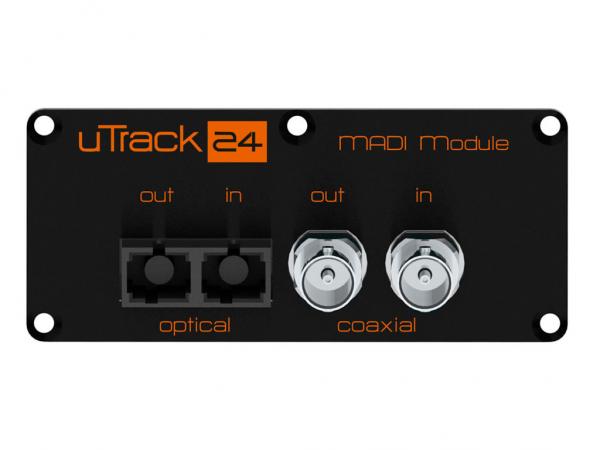 Il tuo uTrack24 è ora pronto per fare sul serio. La nuova accessibile e facilmente installabile scheda MADI integra perfettamente il tuo uTrack24 nel mondo dell'audio digitale high-end. Collega ingressi e uscite del tuo uTrack24 in console audio dal vivo, stage box, sistemi di amplificazione audio e altri dispositivi MADI. Registra la band dalla console e invia un numero enorme di singole basi musicali a qualsiasi sistema MADI, il tutto con solo 2 cavi che possono essere estesi per centinaia di metri.