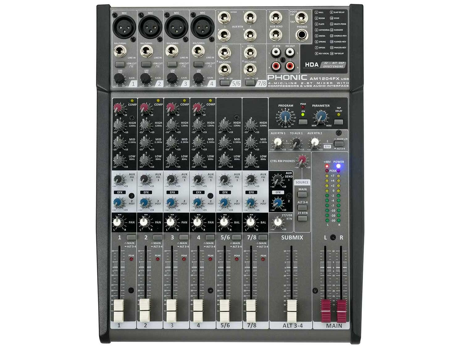 I mixer compatti AM 1204FX USB dispongono di quattro input mono microfono / linea assieme a due ingressi di linea stereo per opzioni di input flessibili. Ciascun canale è dotato di un super-musicale equalizzatore a 3 bande, mentre i canali mono offrono anche filtri low-cut 75Hz per eliminare il rumore del palco e altri suoni a bassa frequenza indesiderati. L'AM 1204FX USB dispone di un processore a 32-bit DFX con 16 effetti preimpostati ognuno con il suo parametro regolabile dall'utente. Tutti i mixer AM 1204FX USB offrono un ALT 3/4 mix che reindirizza i segnali silenziati da tutti i canali al proprio mix. Un interfacce audio stereo USB permette di inviare in streaming due tracce audio da e verso qualsiasi PC o Mac. Tutti i mixer USB AM 1204FX offrono ALT 3/4 mix aggiuntivo che reindirizza i segnali silenziati da tutti i canali verso il loro mix.