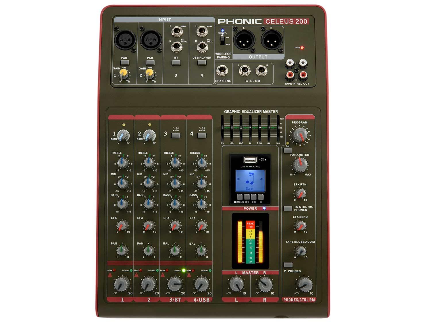 I mixer analogici Celeus hanno fatto la loro prima apparizione al NAMM del 2015. Avvenuta sulla scia della popolare serie AM, Celeus aggiorna la linea analogica Phonic per includere moderni involucri di plastica e molto più di semplici ritocchi. Ogni modello include un modulo di registrazione USB on-board, interfaccia USB per la registrazione e la riproduzione stereo del computer, più lo streaming senza fili Bluetooth per riprodurre la musica direttamente dal proprio smartphone o tablet.