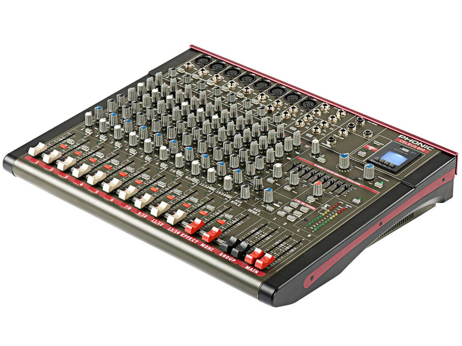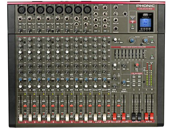 Un mixer analogico per il mondo moderno, la serie di mixer compatti Celeus offre la qualità del suono e le funzionalità all'avanguardia che ci si aspetta da Phonic. Il Celeus 800 Compact Mixer può funzionare sia in modalità 6-mono / 4-stereo che 8-mono / 2-stereo. Dotato di preamplificatori a banda larga eccezionalmente silenziosi ed a bassa rumorosità per una nitidezza ed un realismo maggiori, oltre a effetti digitali a 32/40 bit incorporati, Celeus 800 funziona anche come interfaccia audio USB a 16 bit / 48kHz per la registrazione DAW. Non solo è in grado di registrare su computer (PC / Mac) tramite USB, ma dispone di un registratore / lettore integrato in grado di registrare file MP3 su chiavette USB o riprodurre file MP3 e WMA per l'accompagnamento o la musica di sottofondo durante le pause. Inoltre, la sua capacità di trasmettere l'audio dai dispositivi Bluetooth offre un modo alternativo di riprodurre richieste speciali da parte degli utenti durante le pause.