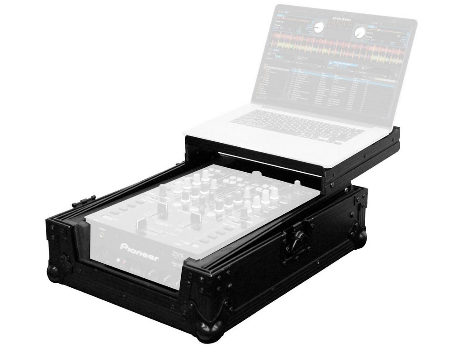 Flight case in grado di contenere un set composto da mixer da 10" (anche con scheda audio interna) e laptop fino a 17". Questo modello impiega un piano rialzato a slitta per posizionare un laptop o altri device e, grazie al particolare disegno dello chassis, questo modello permette di trasportare il materiale già installato senza rischi per il trasporto. Tutte le superfici e i profili sono colore nero satinato