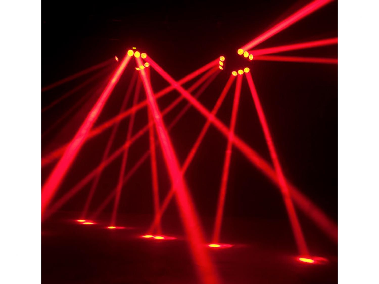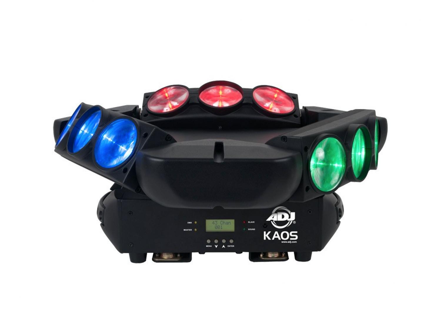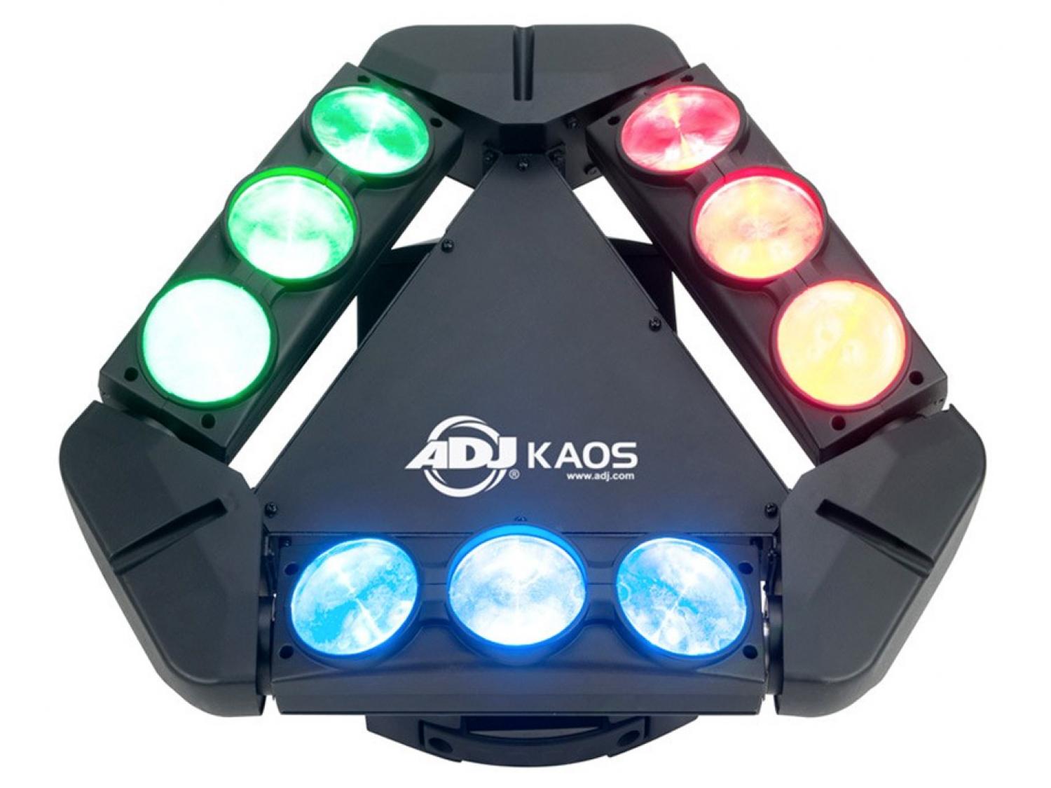 ADJ KAOS crea emozionanti giochi di luce con i suoi raggi in rapido movimento, la matrice 3x3 e l'effetto strobo e pulsazione a LED. Questo effetto unico nel suo genere è dotato di 9 luminosi LED Cree RGBW da 10 Watt con un angolo di proiezione di 5°, 5 modalità DMX e menu DMX con display LED a 4 pulsanti. Kaos può essere controllato tramite i programmi incorporati, una centralina DMX o con il telecomando UC IR. Ideale utilizzato in batteria, Kaos è perfetto per palchi, club e DJ.
