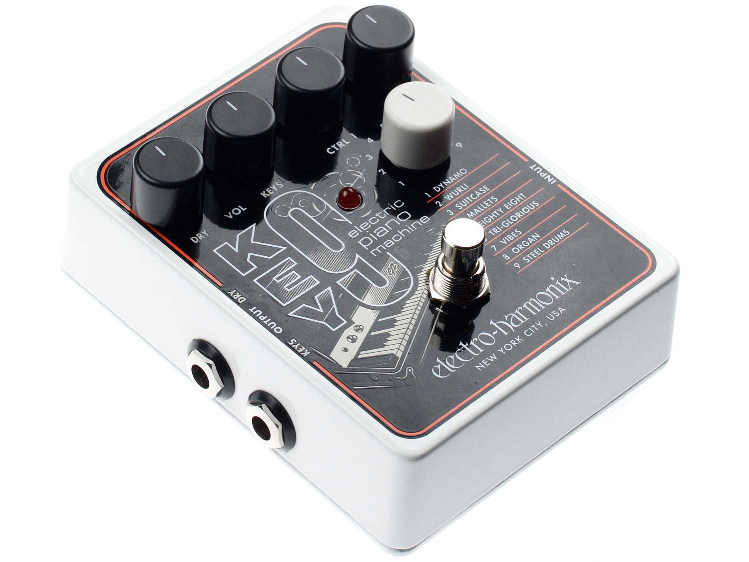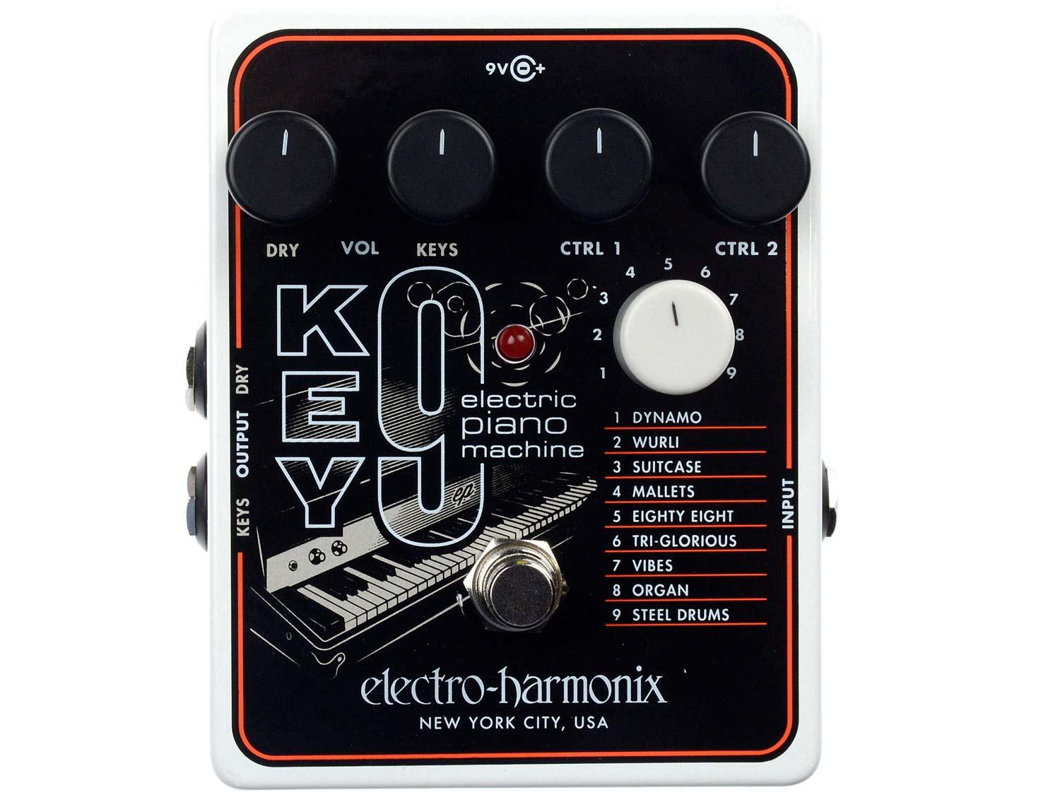 Completamento della potente trilogia forgiata dal B9 e C9 Organ Machine, il KEY9 emula i pianoforti elettrici più ambiti del mondo. Con 9 preset è possibile trasformare la tua chitarra e definire un groove stile "Riders on the Storm" o un funk impetuoso stile "What I Said!". Il KEY9 dispone anche di vivaci riproduzioni di vibrafono, mallet, di un organo, e anche percussioni d'acciaio. Basato sui popolari pedali EHX B9 e C9, il KEY9 si sposta nel territorio elettro-acustico tramite manopole che controllano il volume DRY e KEY, così come specifiche caratteristiche di preset, che sono regolati dalle manopole CTRL 1 e CTRL 2.
