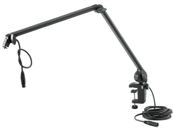 Un esclusivo braccio microfonico con connettore con filettature da 3/8" o 5/8" in un design moderno. E' dotato di un un morsetto da tavolo innovativo per un posizionamento rapido e semplice di un microfono in studio o su una workstation multimediale. Il cavo microfonico di 6m guidato internamente ha un connettore XLR a 3 pin. Microfoni con un peso max di 1,5kg si possono facilmente tenere in qualsiasi posizione. La larghezza di bloccaggio da 0 a 52mm permette di collegare il morsetto ad una grande varietà di superfici. La costruzione in metallo con inserti in plastica di alta qualità garantisce una tenuta sicura e forte. Le parti di fissaggio abilmente sagomate consentono di utilizzare il morsetto su superfici lisce e tubi a forma rotonda. Il braccio del microfono può anche essere fissato con la flangia da scrivania 23855 disponibile come optional.