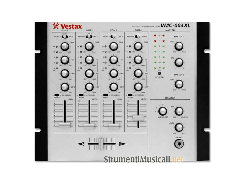 The VMC -004 XL is Vestax's first non 19" 4 channel entry level mixer with high end features. This mixer is just under 13" and 6 rack spaces. This is Vestax's most inexpensive four channel mixer ever made. This amazing entry level mixer comes with enough features to ensure that any beginner DJ has more than enough room to grow. Suitable for all musical styles, including scratch, the VESTAX VMC-004 XL comes with 4 channels each with a 3 band ISOLATOR and one of the smoothest crossfaders available. Vestax's industry knowledge and technology has brought you a new compact series, the VMC. Wherever the location, whether a bar, club, bedroom or restaurant the VMC is capable of all. Small, compact, yet fully functional to compete with high-end mixers is the VMC. Whether your sound source is a turntable, CD, DVD, HD and even memory audio, the VMC was produced to handle all, with 4 independent program channels, 2 master outputs, so whether this piece is your master mixer or even as a second mixer, the VESTAX VMC-004 XL will do it's job! Each channel has a 5 segment LED meter which allows you to adjust each channel to match the exact level of the main channel; this allows you to transfer from one channel to another hearing a change in the music & not a change in volume. This feature is critical if you plan to make mix CD's. The crossfader has 2 curve settings. One is a sharp slope, the other is normal slope. When the switch is in the LEFT position, the crossfader will have a long curve fading in & out smoothly. This is perfect for mixing house, techno & trance. If the switch is in the RIGHT position, the fader will have a sharp curve, allowing for quick punch-ins which is ideal for hip-hop & Drum & Bass. The Vestax VMC-004 XL also has one of the most advance headphone monitoring systems in the world. The mixer has CUE SELECT as well as CUE/MASTER mix knob which allows you to mix in the headphones by selecting any of the channels and mixing it in with any level of the master.