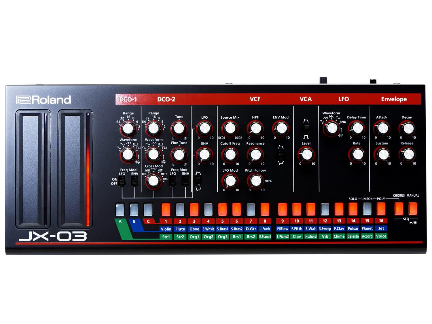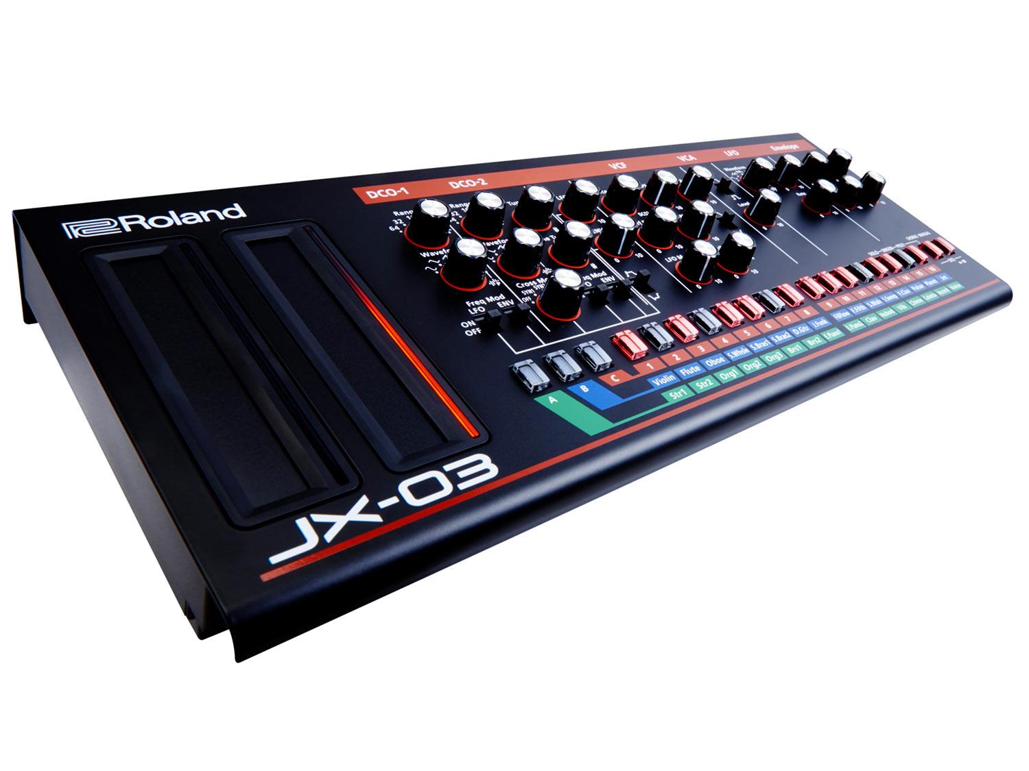 Il modulo Roland Boutique JX-03 riporta in vita il JX-3P. Il modello originale fu presentato quando le interfacce a bottoni erano molto popolari, fu quindi progettato per dare l'accesso immediato ai suoni di preset. In verità però era molto programmabile, specialmente se usato con il controller opzionale PG-200, che aggiungeva 24 manopole per la creazione istantanea dei suoni. La serie limitata a 4 voci JX-03 eredita tutti i 24 knob del PG-200, così come il carattere distintivo del JX-3P. Roland ha anche aggiunto alcuni extra non presenti nell'originale, incluse nuove waveform, un range del DCO ampliato e le opzioni di cross modulation. Potrete anche alloggiare il JX-03 nella tastiera opzionale K-25m, per un synth da portare ovunque.