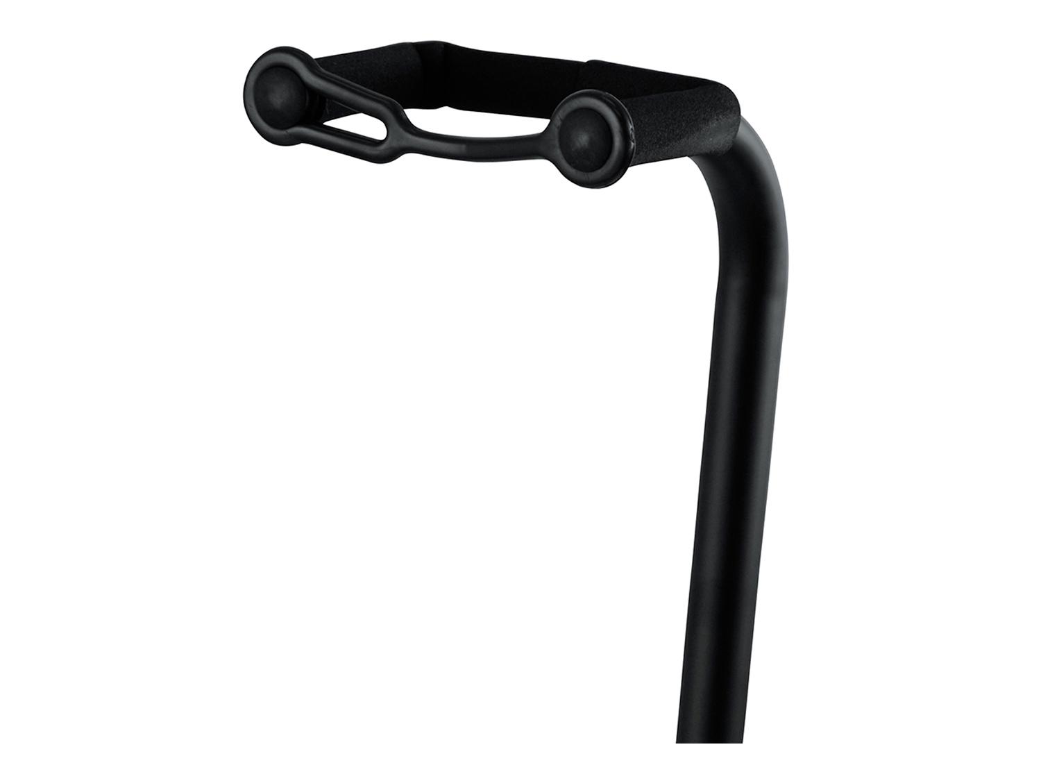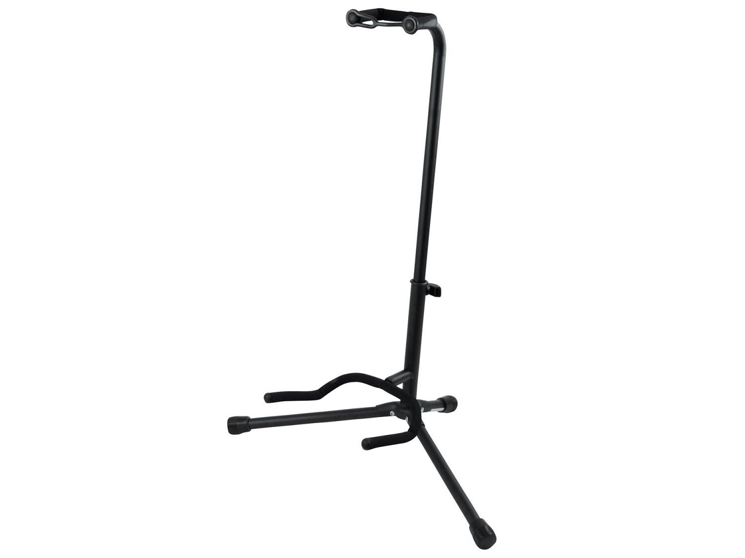 Un supporto da terra per chitarra e basso con occhiello di sicurezza per impedire che il manico scivoli via dal supporto. E' rivestito in gomma nei punti che vengono in contatto con lo strumento.