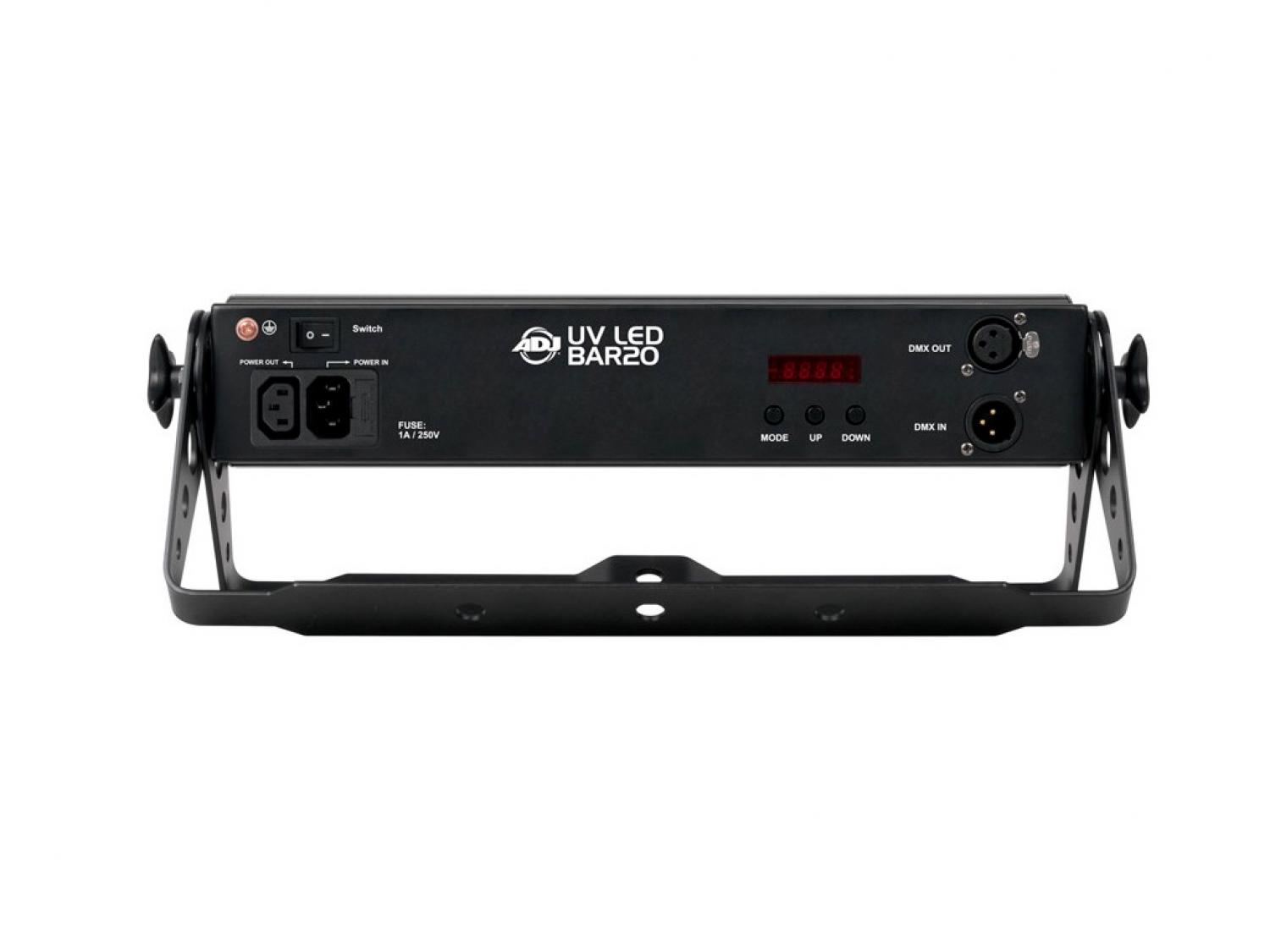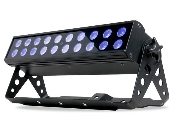 Il UV LED BAR 20 è una barra UV a LED ad alta potenza dotata di telecomando wireless per controllare con facilità accensione e velocità strobo. Equipaggiata con 20 LED UV da 1W, ha un assorbimento massimo di soli 30W. L'angolo di proiezione di 10°x40°, la lunga durata dei LED (50000 ore stimate) e la sostanziale assenza di manutenzione rendono UV LED BAR 20 una soluzione ideale come wash UV per palcoscenici, club, locali, bowling, piste di pattinaggio e centri ricreativi.