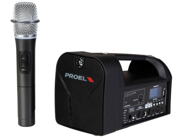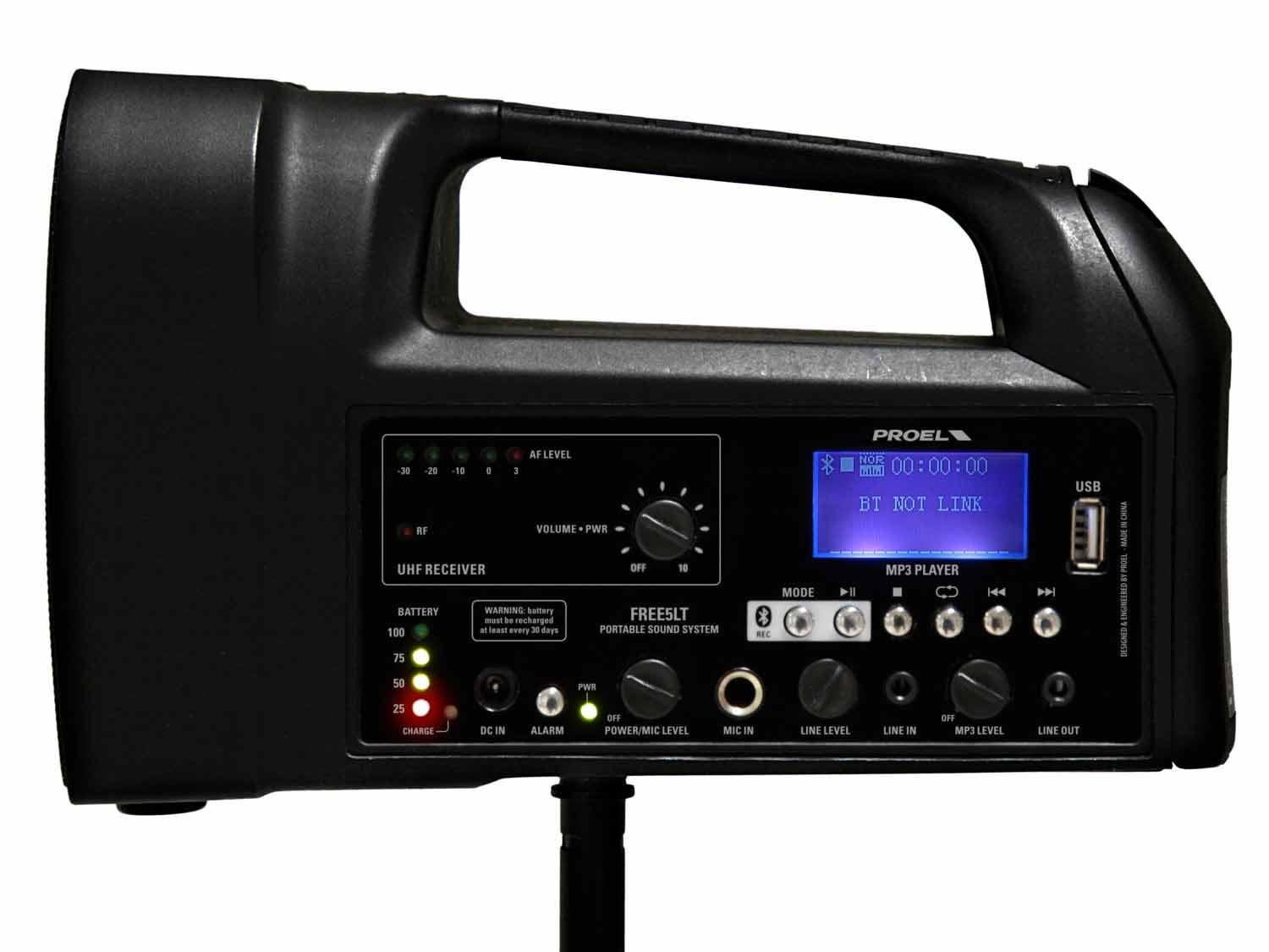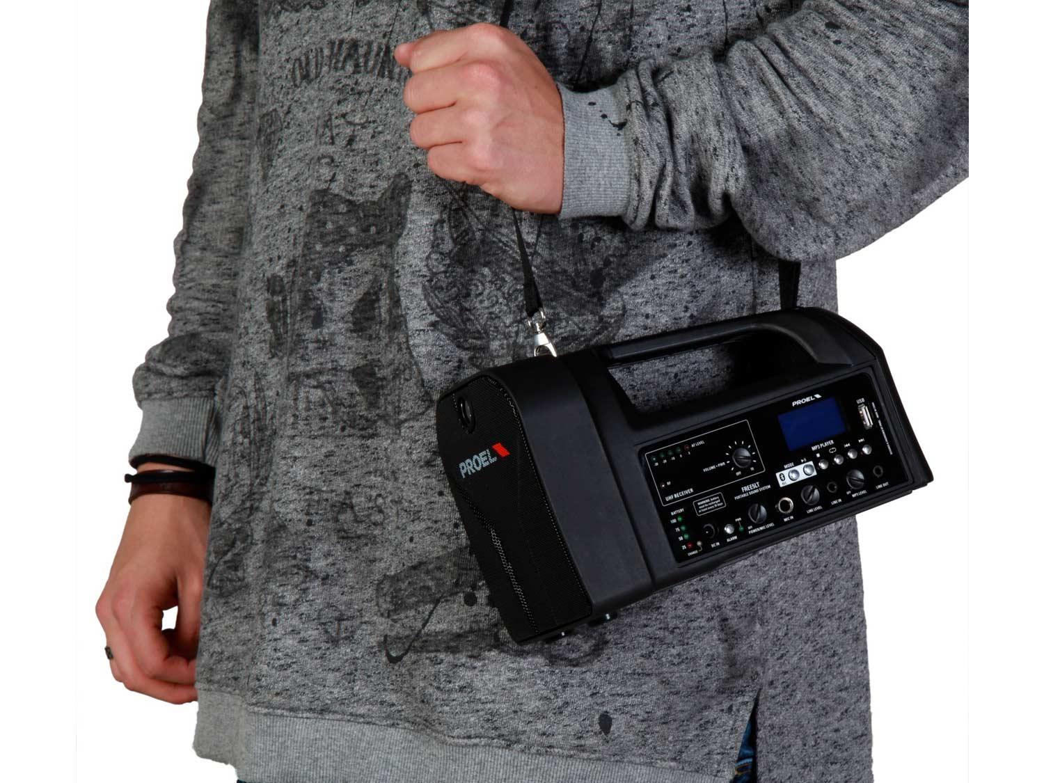 I sistemi Free di Proel offrono la possibilità di suonare la tua musica o di amplificare il tuo suono in libertà, senza preoccuparsi di dove collegare il cavo di alimentazione, di come collegare il lettore MP3 o di come regolare il microfono. Free5lt è un sistema di amplificazione combinato alimentato a batteria, con un set completo di funzioni ed un suono inaspettato per questo tipo di prodotto. Include un lettore MP3 con porta USB e connessione Bluetooth, dotato di ampio display e di un set di controlli completo. Free5lt è alloggiato in un cabinet in plastica compatto e resistente, che fornisce la massima portabilità e protezione, ed è dotato di flangia per l'installazione su un'asta microfonica standard. Con un altoparlante ad ampio spettro da 5" ed un amplificatore da 20W, il Free5lt rappresenta il sistema multiuso all-in-one perfetto per applicazioni indoor e outdoor, in cui sono richiesti un suono di qualità e funzionalità avanzate. Il modulo wireless incluso fornisce un collegamento pulito e senza problemi con il microfono a mano fornito di serie, per la massima libertà di movimento. La batteria interna ricaricabile Li-ion fornisce fino a 4-5 ore di funzionamento senza collegamento alla rete.