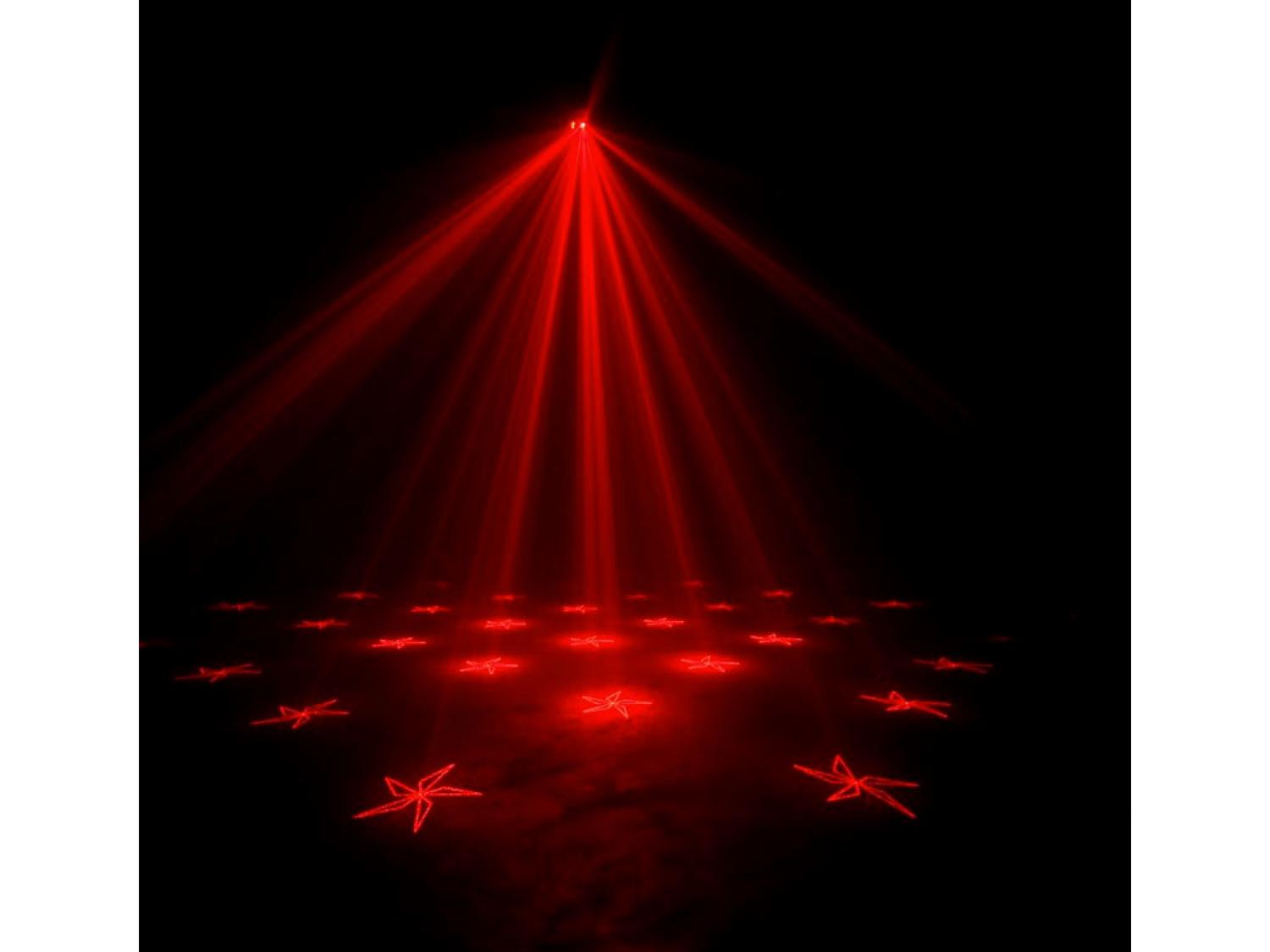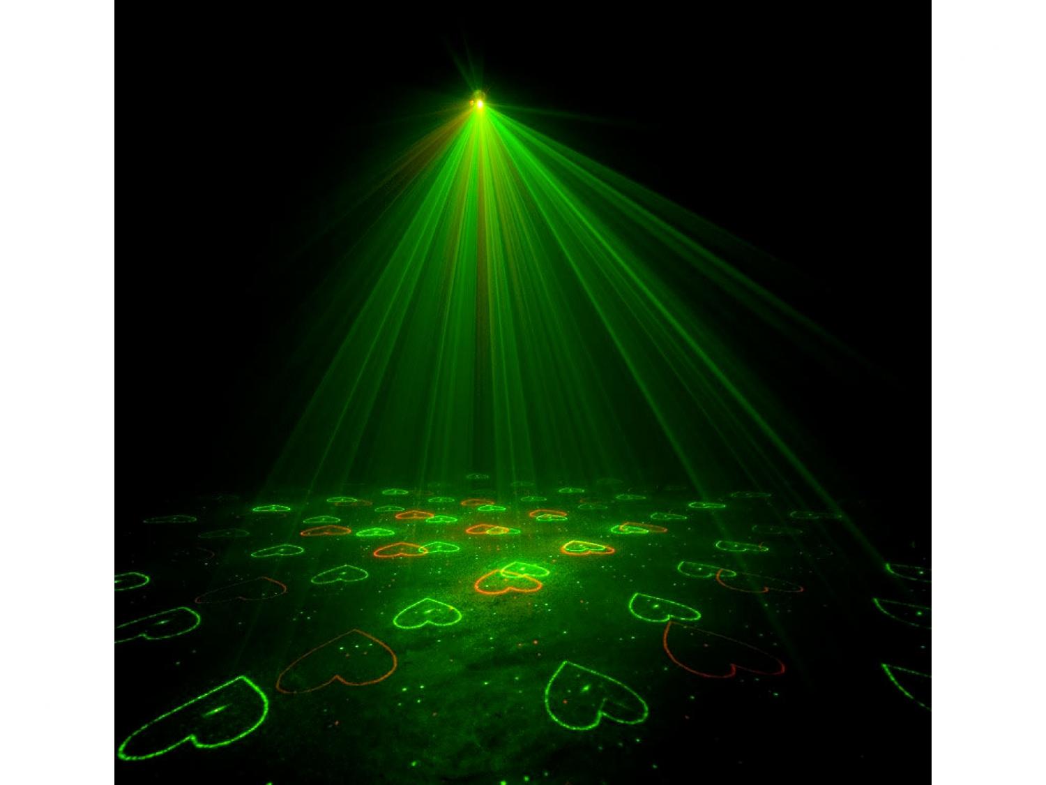 • Crea più di 200 raggi verdi e rossi con motivi gobo che possono essere proiettati su pareti, soffitti o piste da ballo