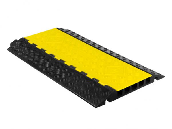 Pedana passacavo certificata in gomma e poliuretano, con coperchio ribaltabile in PVC antiscivolo. E' dotata di 5 canaline e può sopportare un carico massimo di 3500 kg.