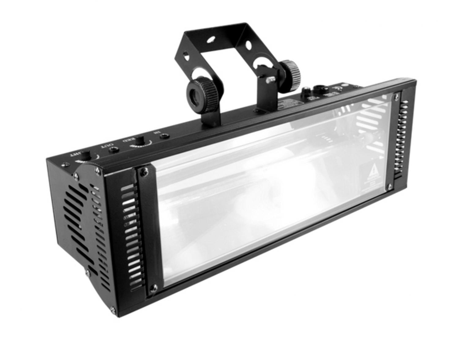 Effetto Strobo 1500W. Funzionamento automatico tramite due potenziometri, uno per la regolazione della velocità di lampeggio ed uno per la regolazione dell'intensità luminosa, dotato di staffa di fissaggio orientabile.