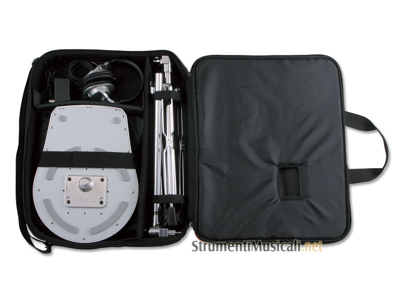La borsa CB-HPD-10 può comodamente ospitare un HandSonic® di Roland o uno strumento della serie SPD, assieme al suo supporto e relativo sostegno, adattatore AC, e cuffie.