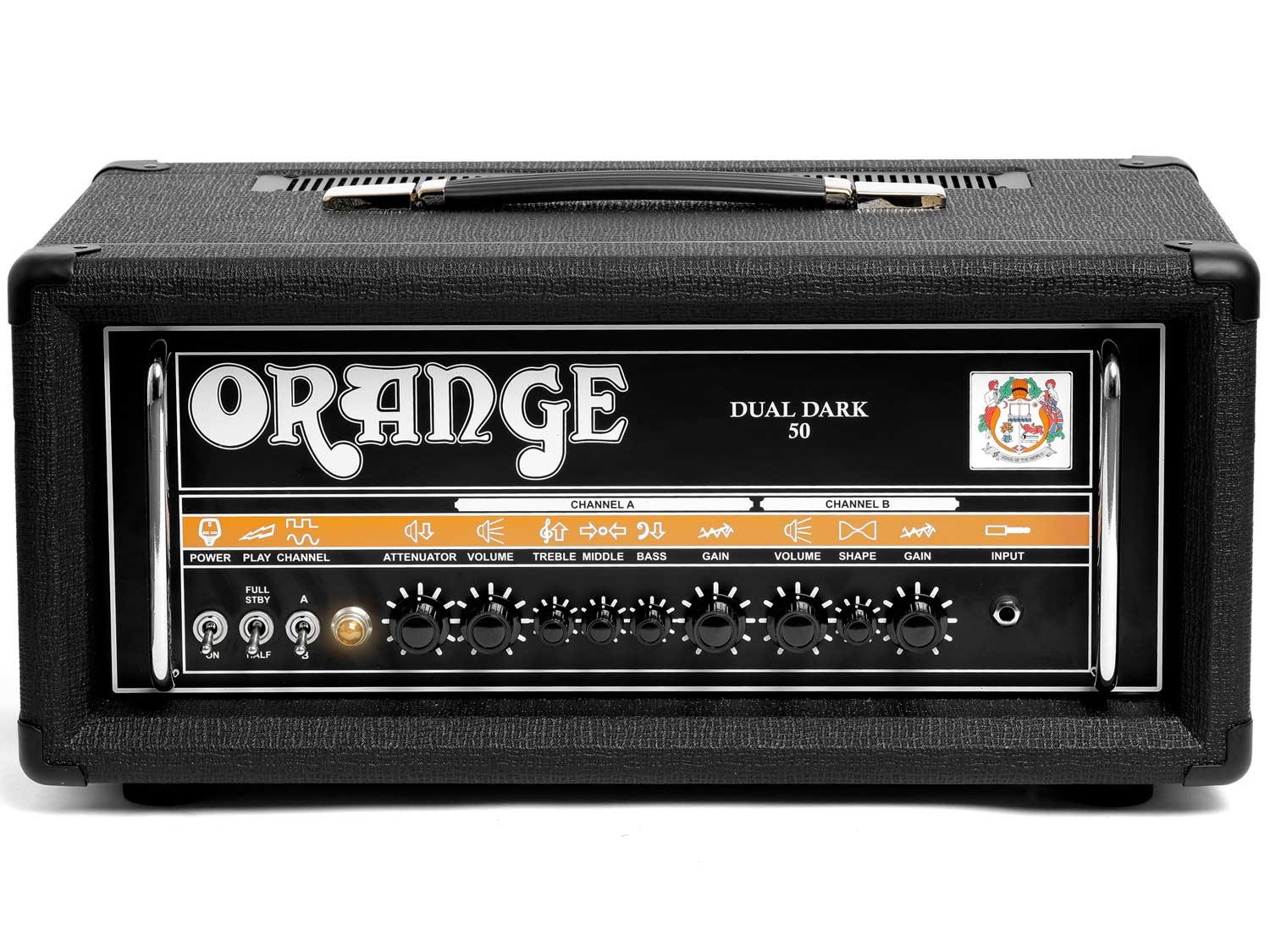 Gli amplificatori Orange con più alto Gain, fino ad oggi, ed i primi amplificatori ad offrire quattro stadi di guadagno su due canali, le testate Dual Dark sono aggressive e flessibili allo stesso tempo. Con controlli del guadagno e del master volume sia in A che in B, entrambi i due canali possono fornire suoni puliti, overdrive o folli distorsioni, rendendo questi amplificatori incredibilmente flessibili, nonostante le loro evidenti inclinazioni metal. Il canale A è un design completamente nuovo, con un voicing che rivela un equalizzatore grasso e potente con forti medi aperti ed una risposta stretta. Il canale B trae le sue origini dall'amato Dark Terror, con un attacco fulmineo perfetto per i riffing percussivi down-tuned. L'intuitivo controllo Shape, prima apparizione sull'acclamata serie Thunderverb, riguarda la risposta di fascia media, mentre interagisce contemporaneamente con alti e bassi. Il design proprietario trasformatore di uscita del Dual Dark 50 garantisce nitidezza ed una risposta dei bassi che rimane stretta e focalizzata, fino a volumi da palco. Non fatevi ingannare dalla potenza di uscita da 50 Watt. Questa testata suona senza mai compromessa, anche se spinta al limite. La potenza piena di 50W può anche essere ridotta a 25W per una distorsione delle valvole di uscita a basso volume.