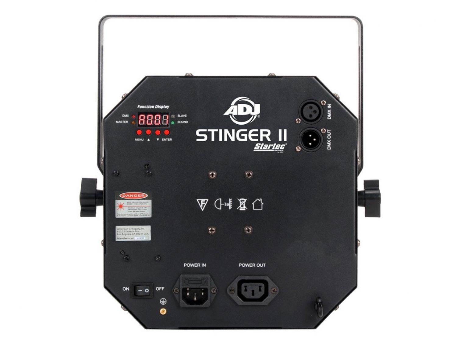 Simile allo Stinger 1, ADJ Stinger II è un effetto luce 3-in-1. Differisce dal modello precedente per gli otto LED UV da 3W e, grazie ai nitidi raggi luminosi in grado di riempire una stanza, permette nuovi emozionanti giochi di luce a DJ, band, bar, club e bowling. I LED UV, combinati con gli HEX LED del moonflower e i raggi laser verdi e rossi in stile "Galaxian" offre numerose opzioni per ore e ore di spettacolo. Il proiettore è dotato di 15 opzioni colore incorporate, motore passo-passo e display DMX con menu a 4 pulsanti. Stinger II è controllabile via DMX, tramite i programmi automatici incorporati, il telecomando wireless UC IR e l'app Airstream IR.