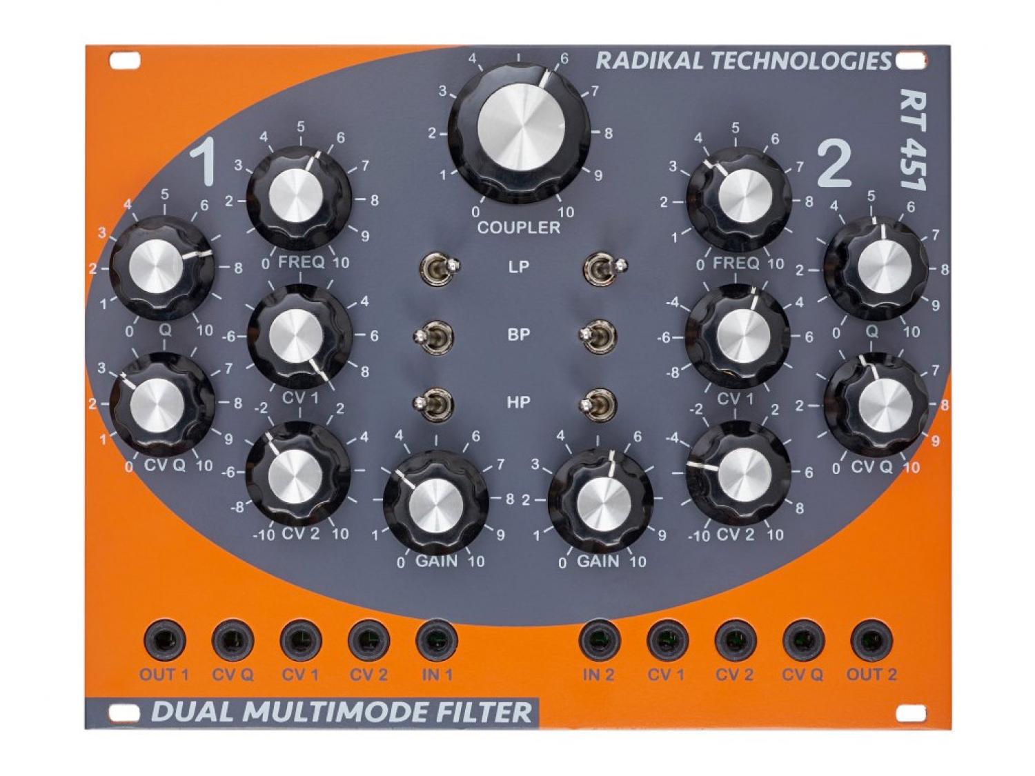 RT-451 è un doppio filtro analogico in formato Eurorack, caratterizzato da due stadi analogici indipendenti basati sul circuito del celebre Spectralis di Radikal Technologies, utilizzabili autonomamente (quindi anche per trattare segnali stereo) o combinandoli in serie o parallelo. Ognuno dei due stadi di RT-451 include varie tipologie di filtri: highpass, bandpass, lowpass, i quali possono essere attivati contemporaneamente per creare articolate combinazioni di filtraggio. RT-451 è estremamente flessibile: i controlli sulla risonanza consentono di ricreare calde sonorità vintage oppure moderni suoni taglienti; la manopola Coupler permette di controllare contemporaneamente la frequenza su entrambi i filtri, siano essi utilizzati in serie o parallelo, con una singola azione. RT-451 è perfetto per l'inserimento all'interno di un sistema di synth in formato Eurorack.