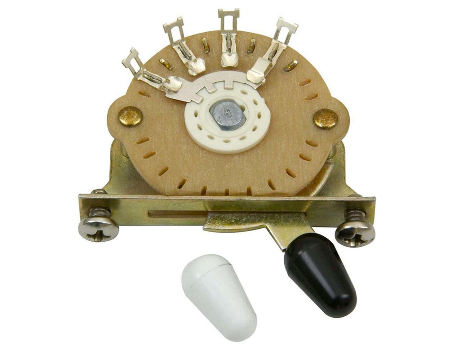 Selettore pickup a 3 posizioni tipo Fender Telecaster con pomelli bianco, nero e viti incluse.