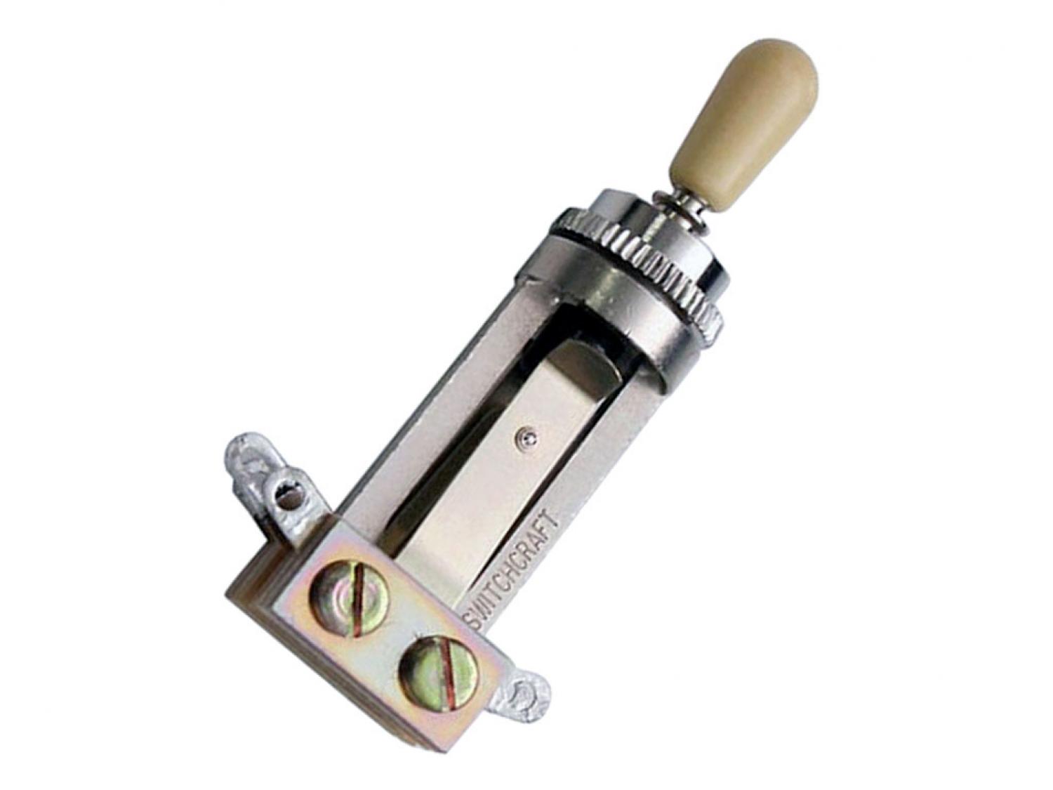 Selettore pickup a 3 vie stile Gibson Les Paul. Dotato di pomello bianco invecchiato e di dado piatto zigrinato. Questo switch si adatta immediatamente alle Gibson USA, con un diametro filettato da 3/8" (9,5mm), altezza filettata da 6/32"(4,763mm) ed una lunghezza di 1 9/16" (39,.69mm).