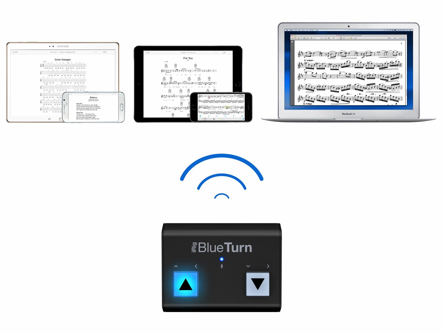iRig BlueTurn permette di condurre una presentazione, suonare, dirigere un'orchestra o portare a termine il tuo discorso lasciandoti libere le mani. Compatibile con iPhone/iPad, Mac e Android grazie alla connessione bluetooth, mediante due pad retroilluminati rende facile ed intuitivo scorrere avanti e indietro spartiti, appunti, slide o semplicemente fogli. Le funzioni assegnabili ai pad sono Page Up/Page Down, Arrow Up/Arrow Down, oppure Arrow Left/Arrow Right.