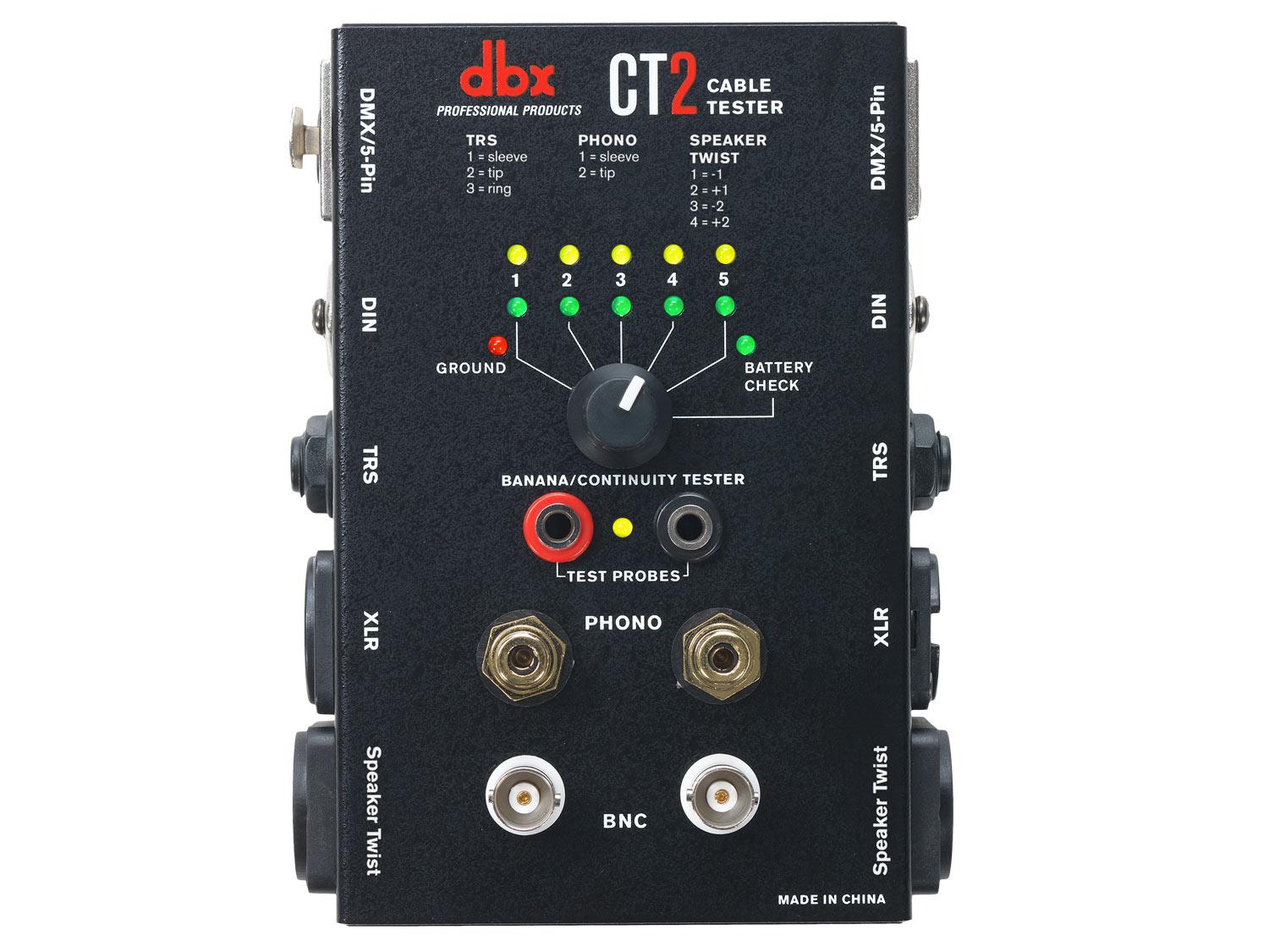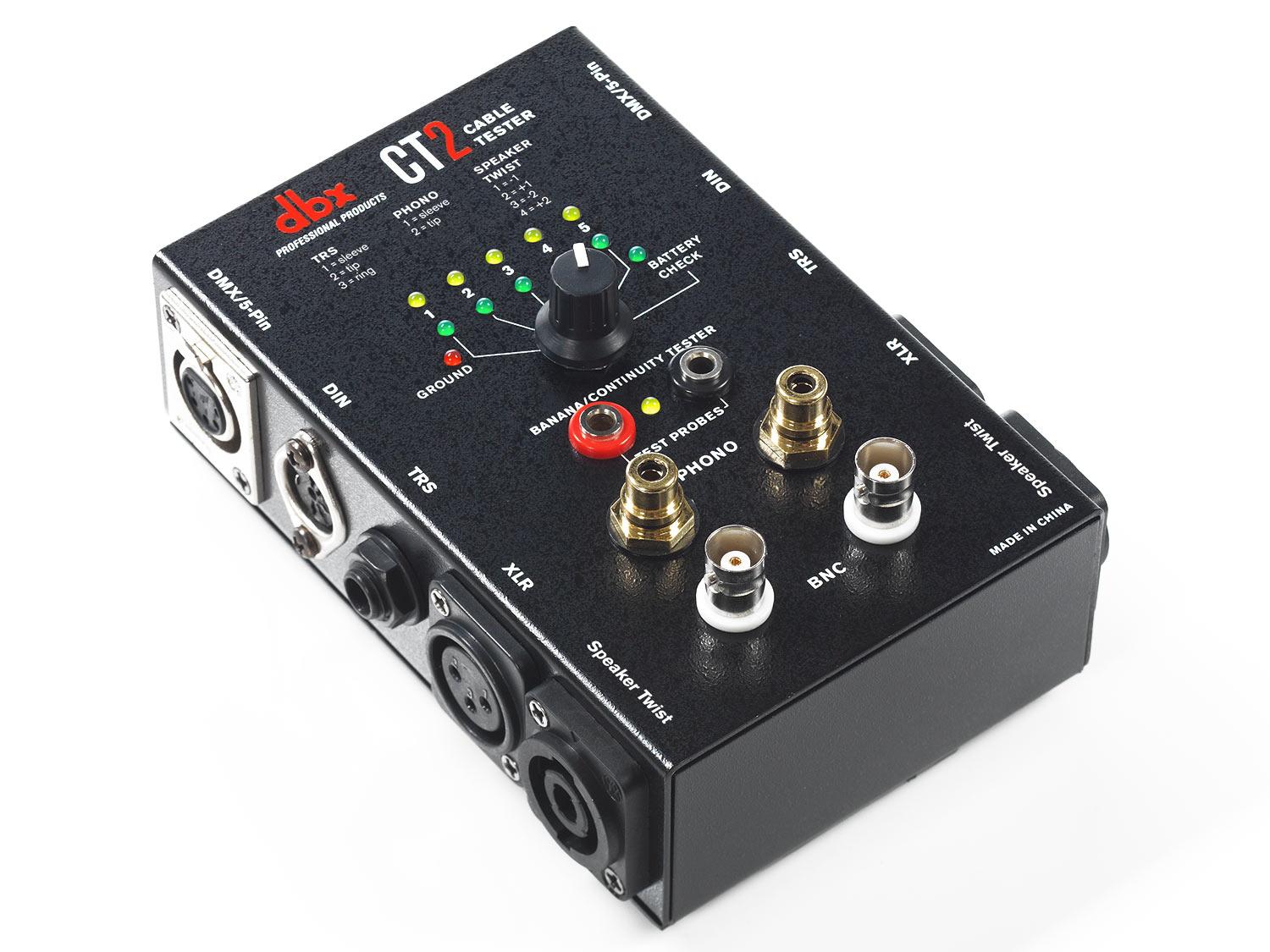 Sappiamo tutti quanto sia frustrante e quanto tempo richieda quando i cavi audio falliscono. Con l'unità di test per cavi dbx CT2 è ora possibile testare facilmente una grande varietà di cavi. La CT2 offre molti connettori comuni come Speaker Twist, XLR, Phono, BNC, DIN, TRS, TS, DMX, e Banana. Il CT2 consente di testare anche cavi con differenti connettori su ciascuna estremità. Ad esempio, è facile testare un cavo da TRS a XLR. Con indicatori LED ben illuminati ed una semplice manopola, gli utenti possono stabilire rapidamente se un cavo è collegato e funziona correttamente, oppure se ha bisogno di riparazioni.