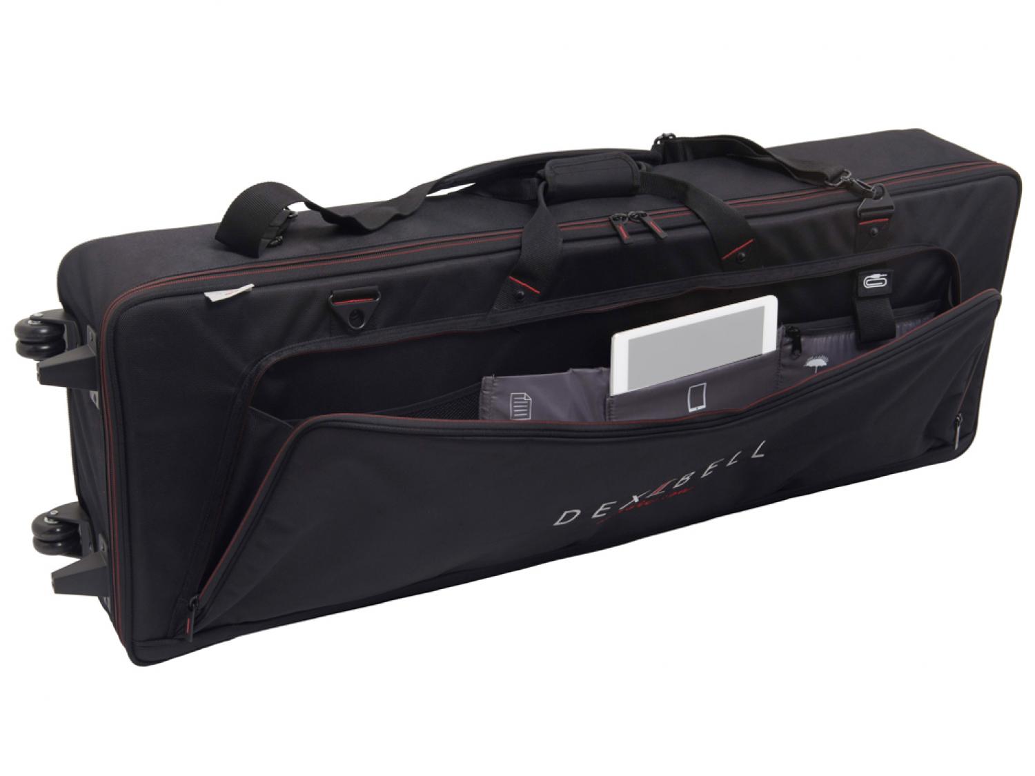 Le Dexibell DX Bag sono custodie semirigide professionali per pianoforti digitali da 73 e 88 tasti, realizzate in Poly 1680D impermeabile ad alta resistenza, con spessa imbottitura in foam ad alta densità e rivestimento interno in morbido tessuto felpato. Sono dotate di strap interno imbottito per fissare saldamente lo strumento, di tracolla rinforzata regolabile e rimovibile, con ganci in metallo e due coppie di resistenti ruote per un trasporto pratico e confortevole. Presentano inoltre una ampia tasca anteriore con compartimenti dedicati a spartiti, accessori, tablet e cavi. E' inoltre inclusa una fodera protettiva per la pioggia.