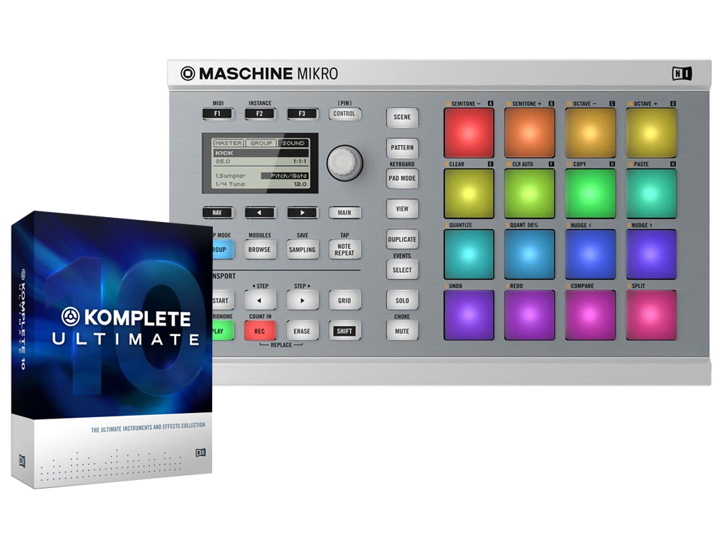 Maschine Mikro è uno strumento professionale per la produzione musicale che combina la flessibilità del software con l'immediatezza dell'hardware, ora aggiornato con nuovi pad multicolore, display migliorato e molto altro ancora. E' possibile creare ritmi, linee di basso, accordi e melodie, costruire tracce on-the-fly con l'intuitivo sequencer clip-based. Maschine Mikro offre anche un potente campionatore, effetti professionali e supporto completo per plug-in Audio Units e VST. E' anche possibile eseguire Maschine Mikro come plug-in nella vostra DAW. Scoprite infine iMaschine , lo sketchpad NI on-the-go per iPhone e iPod Touch. Importa i tuoi progetti iMaschine Mikro in Maschine Mikro per completare le tue idee in studio. Maschine Mikro viene fornito con oltre 6 GB di suoni pronti da usare, professionali e stimolanti. Con l'aggiornamento a Maschine 2.0, tutti gli utenti possono ottenere il leggendario sintetizzatore MASSIVE, un mostro sonoro per bassi e lead con 1300 suoni sconvolgenti. In Native Instruments Komplete 10 Ultimate troverai 75 strumenti e processori ed oltre 17000 suoni pari ad oltre 440GB di contenuti. Dagli aggressivi suoni di batteria e dal potente editing di campioni di Battery 4 ai rigogliosi ed in continua evoluzione pad di Absynth 5 oppure il suono intensamente realistico di pianoforte di The Giant. Ed ancora strumenti di mixaggio eccellenti dalla serie Solid Mix, tra cui processori EQ, Dynamics e Bus Compression da studio, mentre nuovi titoli come l'espressivo Kontour synth ed il versatile Polyplex rendono Komplete 10 Ultimate più flessibile che mai. Ma Komplete 10 Ultimate viene fornito anche di più potenziale musicale rispetto a NI Komplete 10. Suoni aggressivi e moderni da Skanner XT e Razor. Suoni incredibilmente espressivi per film scoring e post produzioni da Action Strings, Damage, Evolve, e Evolve Mutations. Percussioni acustiche ed esotiche in Abbey Road Drummer e Balinese Gamelan, oltre a potenti batterie elettroniche in Maschine Drum Collection. Per chitarre e bassi realistici troverai la collezione di strumenti per chitarra e basso Scarbee. Per stupefacenti arrangiamenti di pianoforte c'è l'acclamato Alicia's Keys così come la Essential Piano Collection. E stiamo ancora solo scalfendo la superficie di Komplete 10 Ultimate.