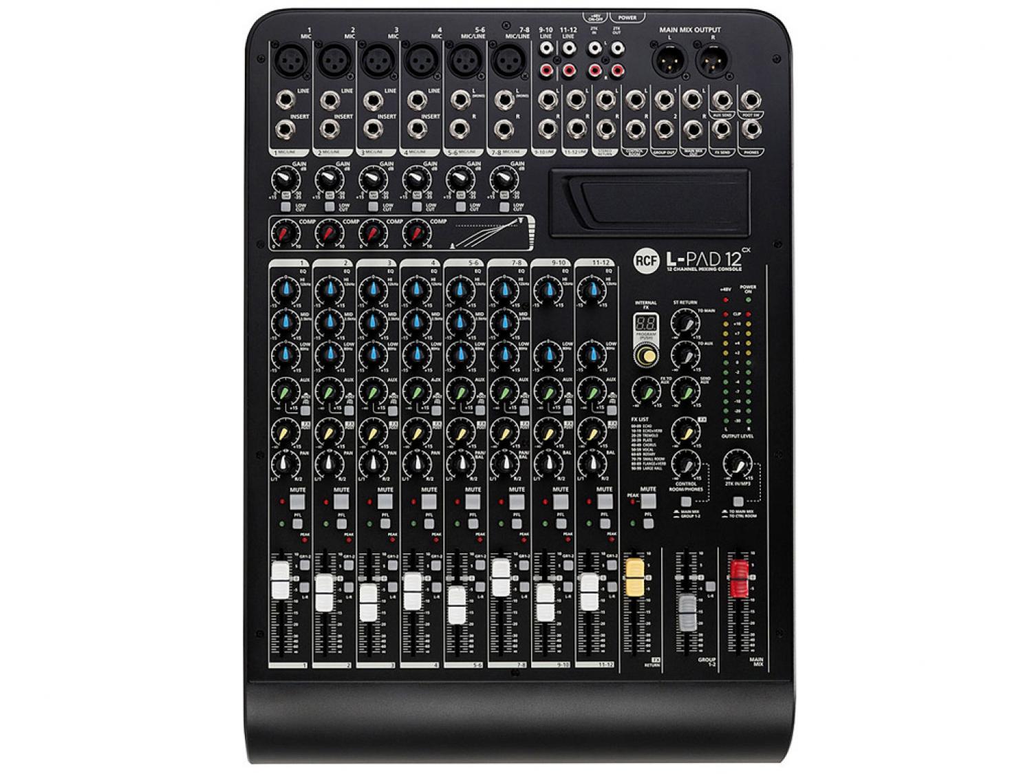Con sei ingressi audio microfonici trasparenti, quattro ingressi di linea stereo e la 2TK In/Out, L-PAD12CX è lo strumento ideale per concerti di piccole band, conferenze, eventi aziendali e tutte le situazioni in cui è necessario gestire diversi segnali. Quattro compressori monocomando sui canali microfonici aiutano a gestire anche i segnali dinamicamente più complessi. Il processore FX DSP interno a 99 preset permette di migliorare il suono con l'aggiunta di effetti realistici e caldi. Quando non in uso per gli effetti interni l'FX send e l'AUX send consentono il controllo di piccoli palchi. Lo slot L-PAD super versatile consente l'inserimento del lettore MP3 L-PAD, lettore / registratore o schede di connessione Bluetooth opzionali.