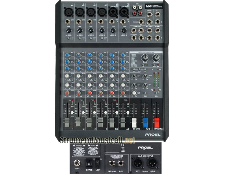 Il modello M8, con la possibilità di collegare fino a 6 microfoni ed una dotazione di funzioni veramente completa, è in grado di soddisfare non solo performers individuali o applicazioni multimediali e di home recording, ma anche le esigenze di una piccola band. Il fitro LO-CUT sui canali MONO, le due mandate AUX, la funzione SOLO e MUTE su ogni canale (con assegnazione alle uscite supplementari ALT 3-4) insieme ai fader da 45 mm per il controllo di tutti i livelli principali e all'effetto PROFEX con 256 presets, rendono questo mixer molto versatile ed adatto ad un'ampia gamma di applicazioni.