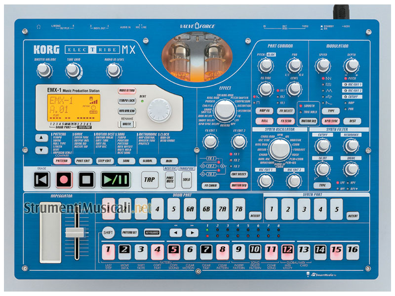 Sulla scia degli acclamati Electribe, il nuovo Electribe MX aggiunge la nuova tecnologia MMT (acronimo di Multi Modeling Technology), piu' una nuova sezione di effetti e un controller Ribbon associato all'arpeggiatore. L'EMX-1 si basa su uno dei motori sonori tra i più avanzati al mondo e fornisce tutto quello che serve per creare sonorità e brani dance in modo veloce e intuitivo, grazie ad una multitimbricità a 16 parti così distribuite: 9 parti di batteria, 5 parti di synth e 2 dedicate agli accenti per drum e synth. Il motore di sintesi offre 16 differenti algoritmi di oscillatore, coprendo così dalla sintesi a modelli analogici a quella additiva, dalla wave-shaping alla PCM basata su una libreria che include 207 suoni di batteria elettronica e 76 di synth pronti all'uso. Grazie al multieffetto integrato, vi è la possibilità di processare attraverso filtri ed effetti le sorgenti sonore esterne connesse in ingresso. Un nuovo parametro drive è a disposizione sul filtro, per produrre la classica saturazione analog-style. Ogni parte può contare su modulazioni quali un LFO e un generatore di inviluppo. Ogni algoritmo del motore di sintesi dispone di 2 parametri manipolabili in tempo reale, più altri accessibili mediante menù, come tipo di forma d'onda e di accordo. Il multieffetto interno permette l'applicazione simultanea di 3 distinti tipologie di effetto selezionabili tra: riverbero, delay, flanger, chorus, tempo-based delay, talking modulator, grain shifter, decimator, ecc.. L'utente potrà indirizzare ogni singola parte ad uno degli effetti, oppure creare grazie alla funzione "chain" una catena di 3 effetti collegati in serie. Per gestire in modo intuitivo ed immediato l'arpeggiatore integrato, l'EMX monta un ribbon controller e uno slider per la modifica rapida dei pattern, ad esempio durante una performance di synth potremo variare la durata delle note con il ribbon controller e allo stesso tempo variare il pattern attraverso il fader. Applicando l'arpeggiatore ad un parte drum invece, toccando il ribbon controller potremo riprodurre i suoni (trigger) e muovendo il dito in verticale potremo andare a variare la risoluzione delle note. La funzione Motion Sequencing registra tutti i movimenti dei potenziometri in tempo reale per poi riprodurli. Due sono i tipi di Motion Sequencing a valori editabili dall'utente: una per le parti e una per gli effetti. I 14 tasti dedicati alle parti e i 16 tasti step presenti sulla plancia consentono di registrare in tempo reale le frasi sonore durante una performance, oppure, usufruendo della registrazione a step, potremo introdurre il timing, la durata e il pitch di ogni nota per volta. Quest'ultima caratteristica accoppiata alla funzione "Chord", che genera automaticamente un accordo premendo una singola nota, farà la felicità dei DJ/Producer meno portati al suonare uno strumento e al tempo stesso velocizzerà l'operato dei musicisti elettronici più smaliziati. L'EMX è dotato di varie modalità di sincronizzazione ai BPM: tap tempo, MIDI Clock, sincronizzazione al tempo impostato internamente.