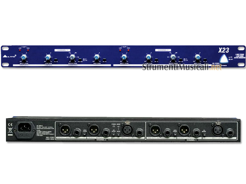 Il crossover ALTO X23 è un apparecchio alto una singola unità rack, un crossover elettronico attivo in grado di gestire il controllo delle frequenze per sistemi di casse acustiche sia nel modo stereo a 2 vie che nel modo mono a 3 vie. Il crossover elettronico X23 è una soluzione ideale di crossover per la maggior parte di impianti di diffusione pubblica piccoli e grandi, impianti di amplificazione dal vivo, installazioni commerciali, monitor per studi di registrazione e sistemi di amplificazione per DJ. Oltre alla sua versatilità per adeguarsi a differenti sistemi di amplificazione, il crossover X23 ha funzioni avanzate come led indicatori di clip, equalizzazione per tromba a direttivitÀ costante ed interruttori individuali di fase e mute per ogni banda. L'X23 è un crossover attivo efficiente ed affidabile, vi darà un controllo preciso e contribuirà al suono eccellente del vostro impianto.