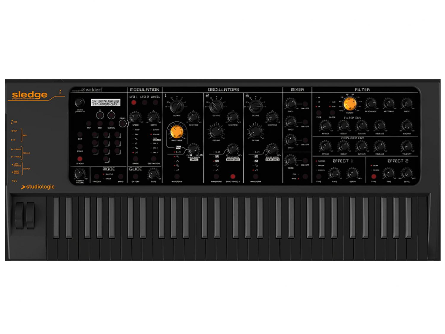 Per molti appassionati, è la particolare interazione dell'interfaccia utente e del motore sonoro e che rendono Sledge un grande strumento. Un rapido sguardo a Sledge mostra il generoso set di comandi disponibili per interagire direttamente con il motore audio. Quando si toccano le manopole e gli interruttori del pannello frontale si è immediatamente consapevole della meticolosa attenzione al dettaglio che che gli ingegneri hanno perfezionato, per molti decenni, costruendo una delle migliori tastiere elettroniche. Vivrete il logico set-up dei moduli sintetizzatore, che rispecchiano il flusso del segnale di un classico sintetizzatore analogico. Ma ciò che distingue veramente qualsiasi sintetizzatore è il suo suono. Fortunatamente alla Waldorf Music hanno felicemente condiviso la loro esperienza e il know-how su questa parte cruciale del Sintetizzatore Sledge. Così è stato utilizzato un cuore DSP di ultima generazione Waldorf in Sledge. Il risultato è una potenza sufficiente per mettere seriamente a rischio le fondamenta del tuo studio. E un sacco di dettagli, per creare i più ricchi pad analogici che si potrebbe desiderare. Oltre alle classiche forme d'onda del sintetizzatore analogico, troverete una serie completa di Wavetables derivata direttamente dalla madre di tutti i sintetizzatori digitali, la PPG Wave. La somma dei tre oscillatori, oltre a un generatore di rumore, sono inseriti nel potente filtro multimode di Sledge con slope selezionabile 24/12dB. Gli algoritmi di filtro Waldorf facilmente riconoscibili consentono una vasta gamma di suoni. Due LFO più un extra Wheel-LFO sono a bordo per offrire enormi, ma facile da capire, possibilità di modulazione. Due unità effetto offrono effetti sofisticati come Chorus, Flanger e Phaser, così come un ricco riverbero o un Delay. La cosa migliore: se hai familiarità con il funzionamento di un classico sintetizzatore analogico, non dovrai spendere tempo prezioso leggendo il manuale. Non ci sono funzioni doppie o multiple su manopole o pulsanti. Tutti i parametri del sintetizzatore sono disposti chiaramente ed in modo ergonomico davanti ai vostri occhi, accessibile sotto la punta delle dita.